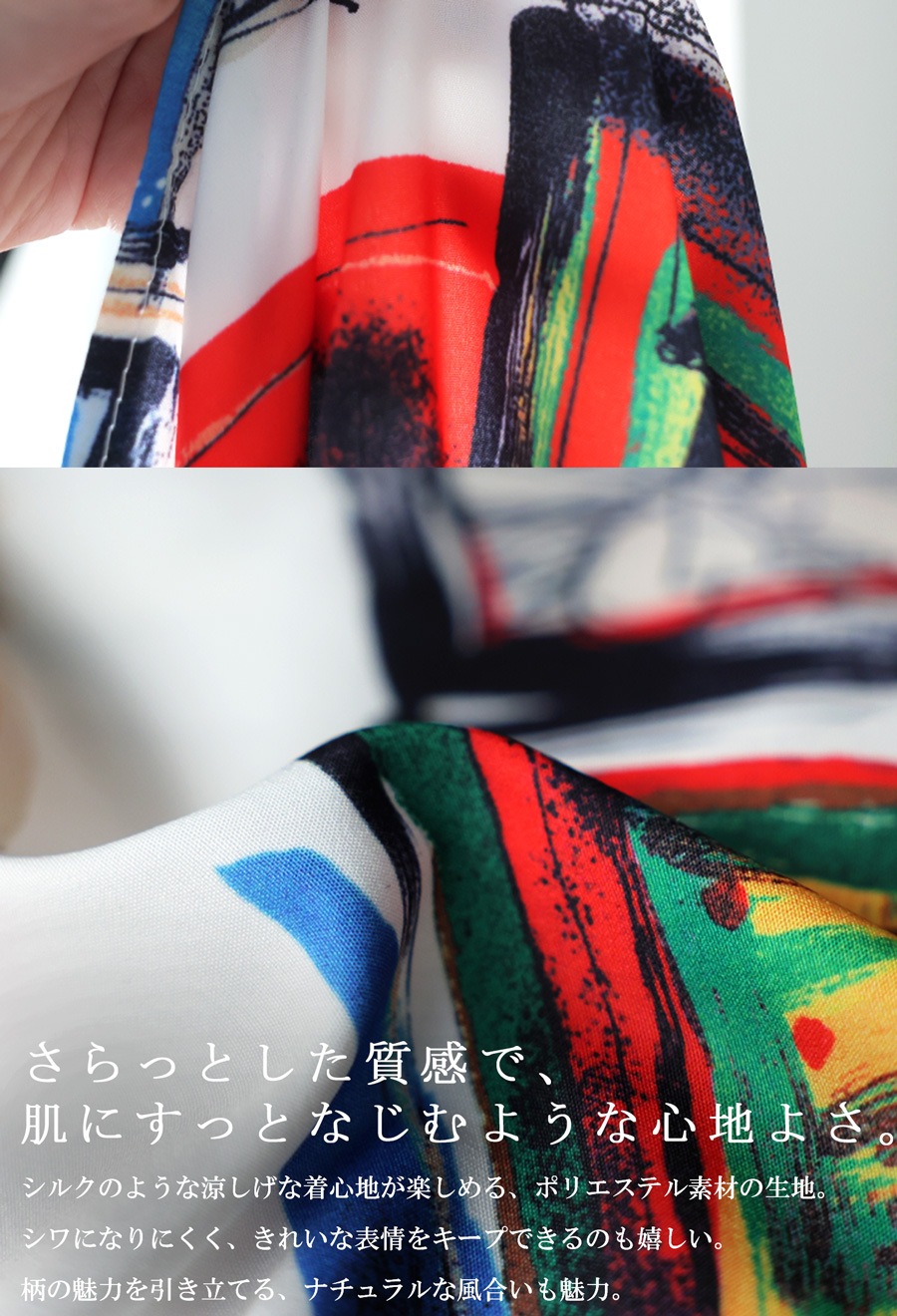 ポリエステル100%素材で、軽やかな質感とさらっとした肌触りが魅力。