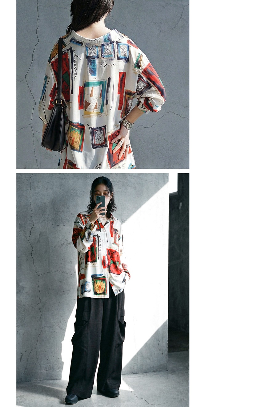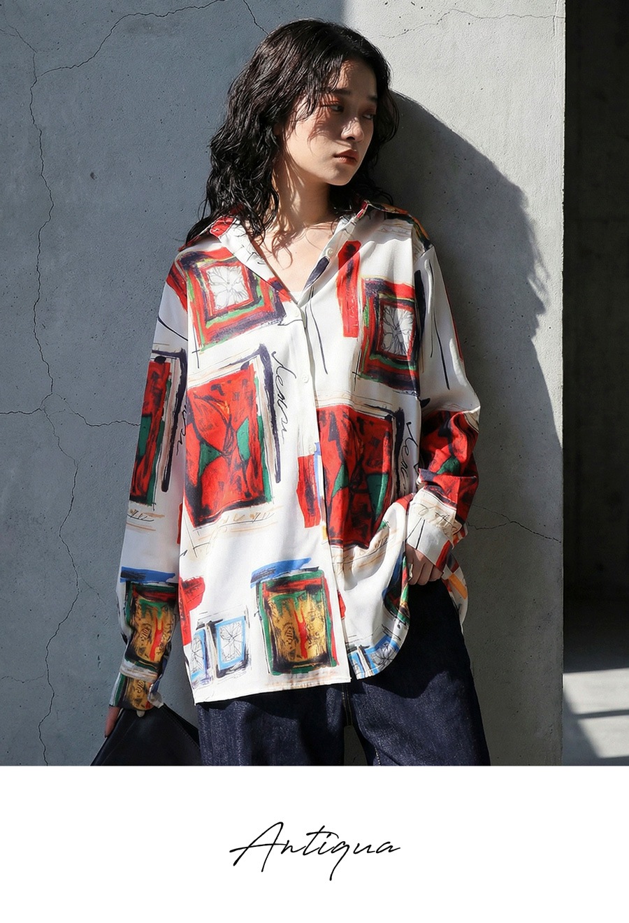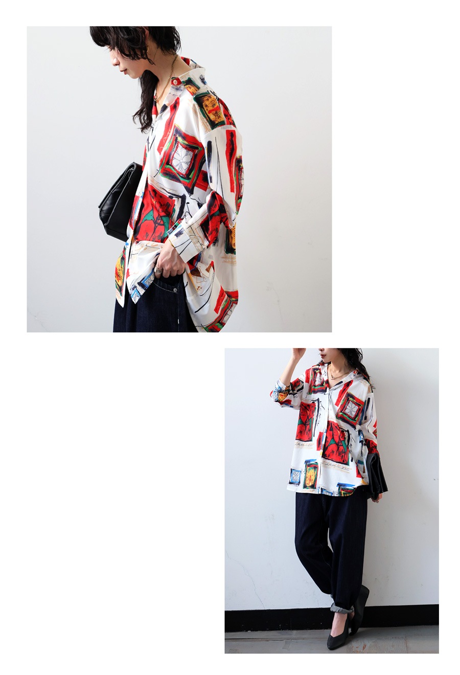 大胆にプリントされた柄は、まるでアート作品のような存在感を放ち、コーディネートの主役にぴったりです。