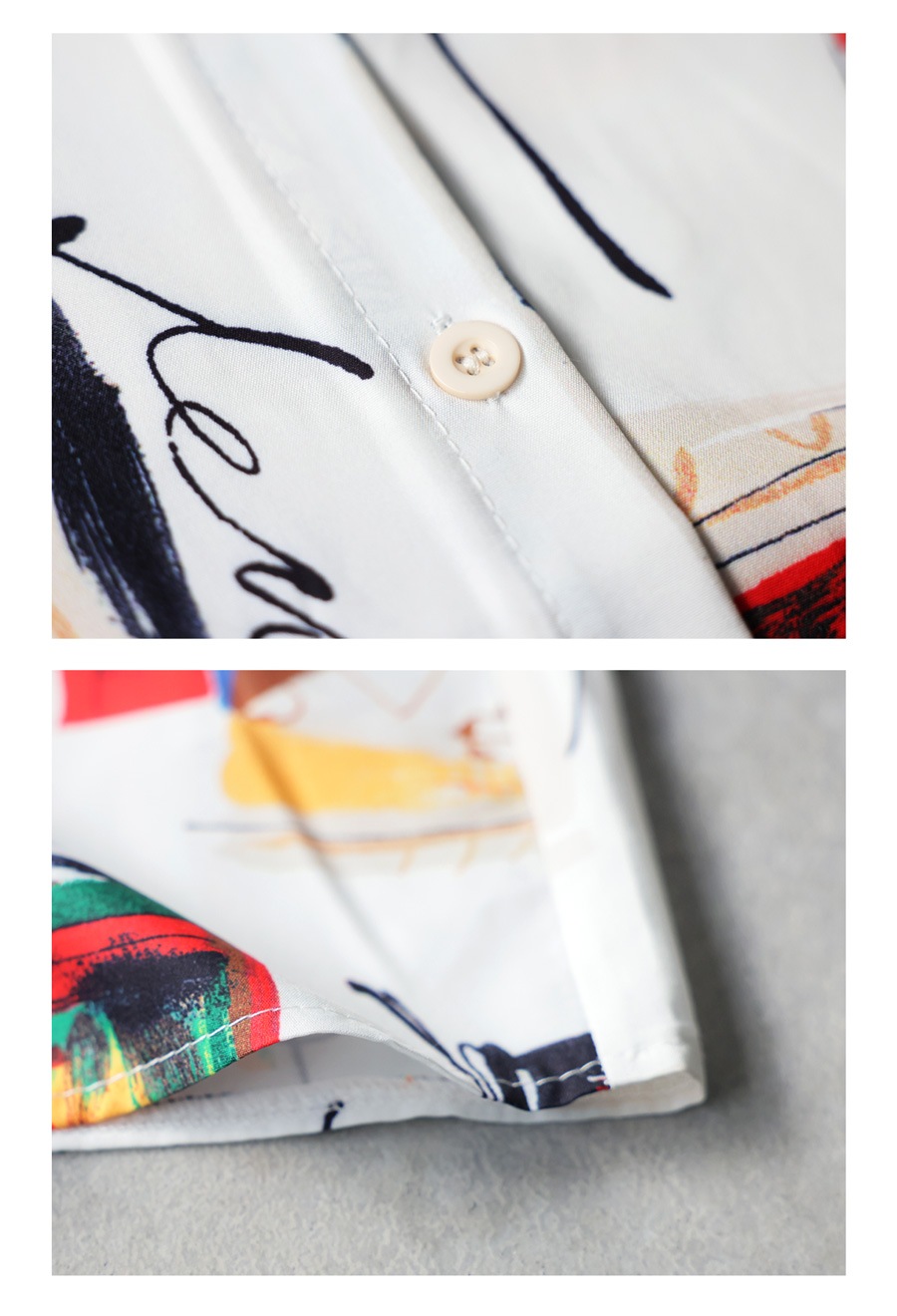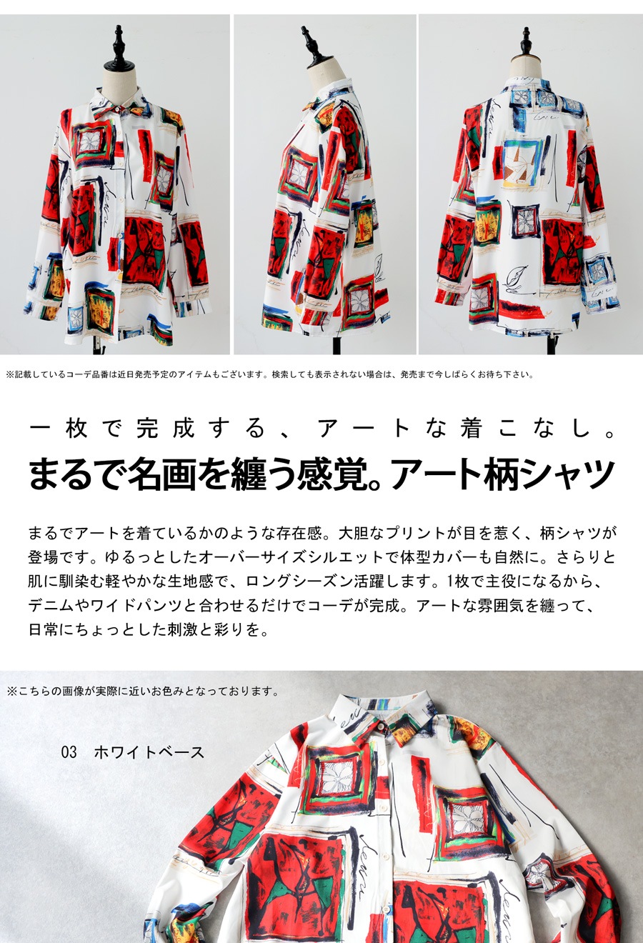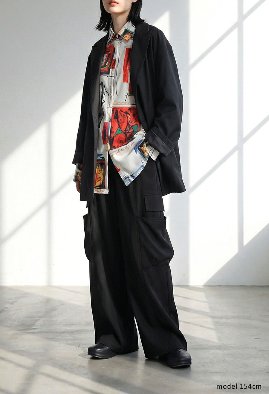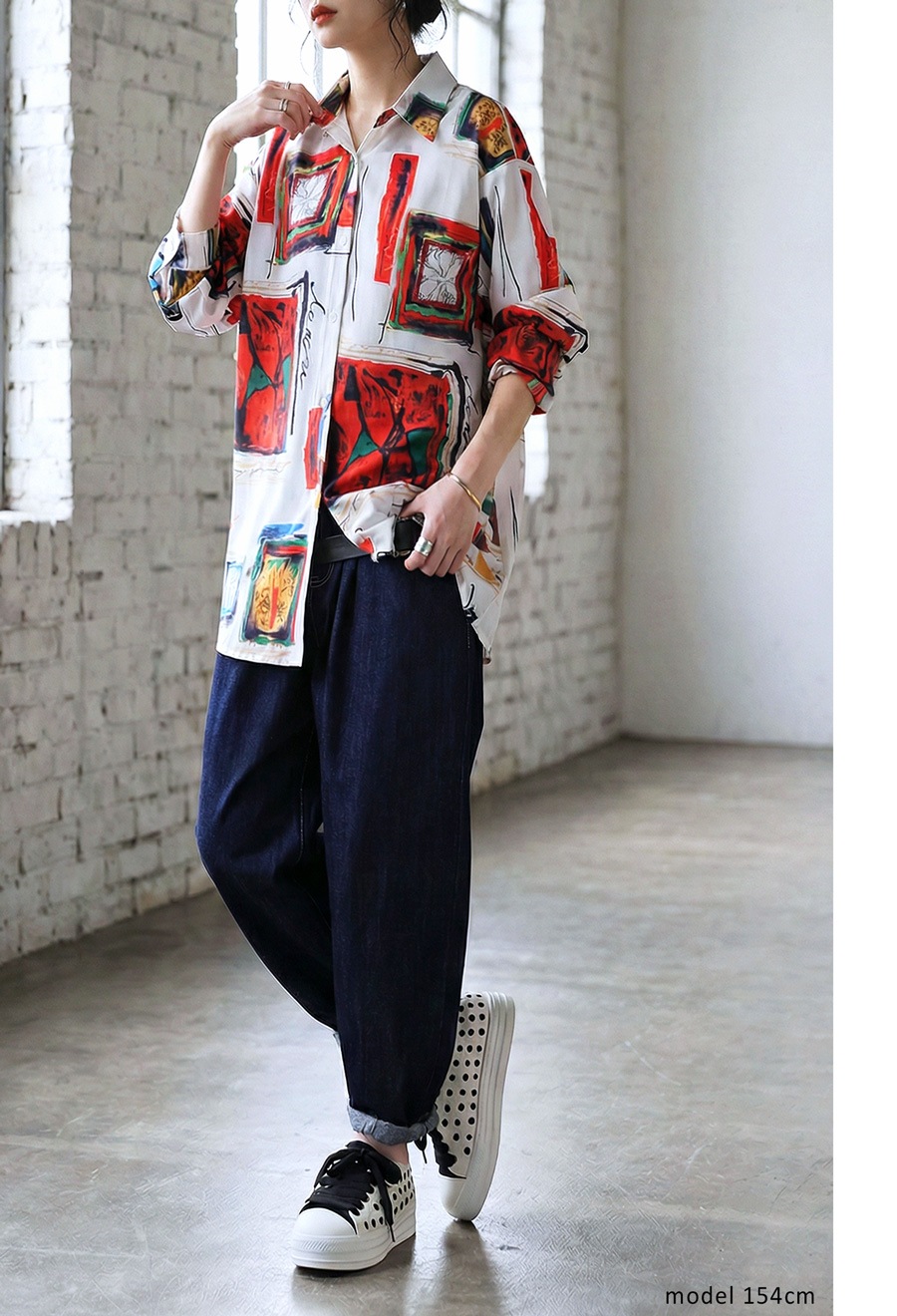 大胆にプリントされた柄は、まるでアート作品のような存在感を放ち、コーディネートの主役にぴったりです。