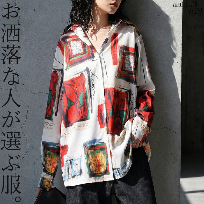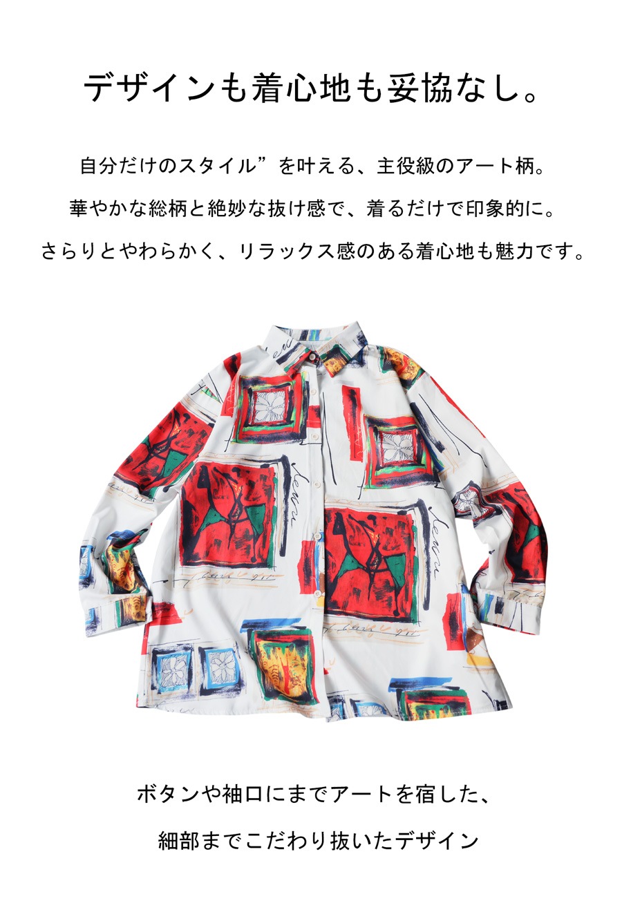 アート柄 シャツ レディース 長袖 レギュラーカラー 送料無料・(50)メール便可
