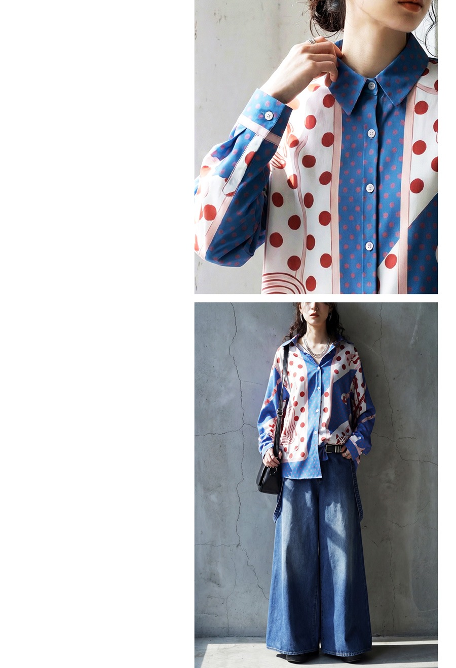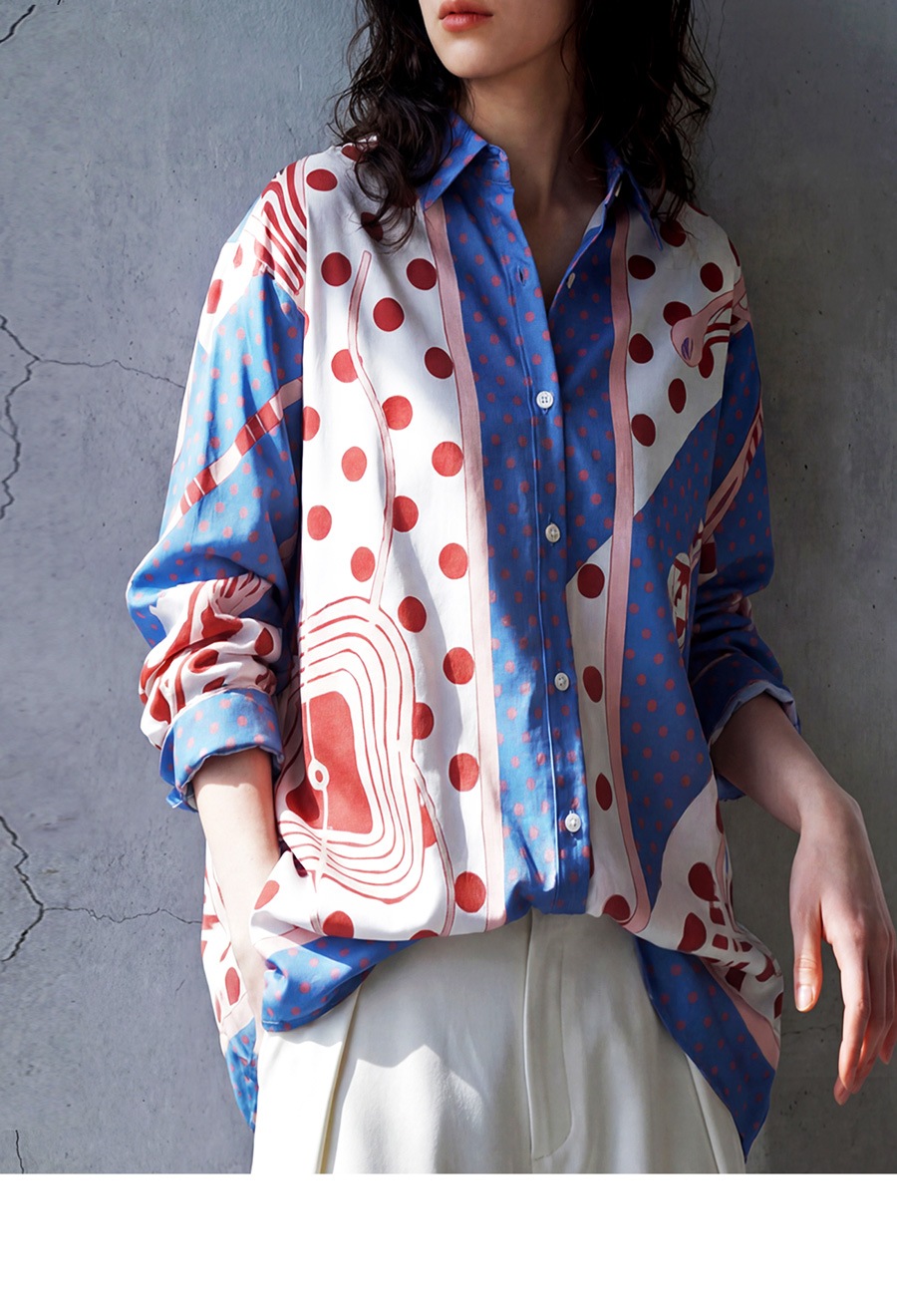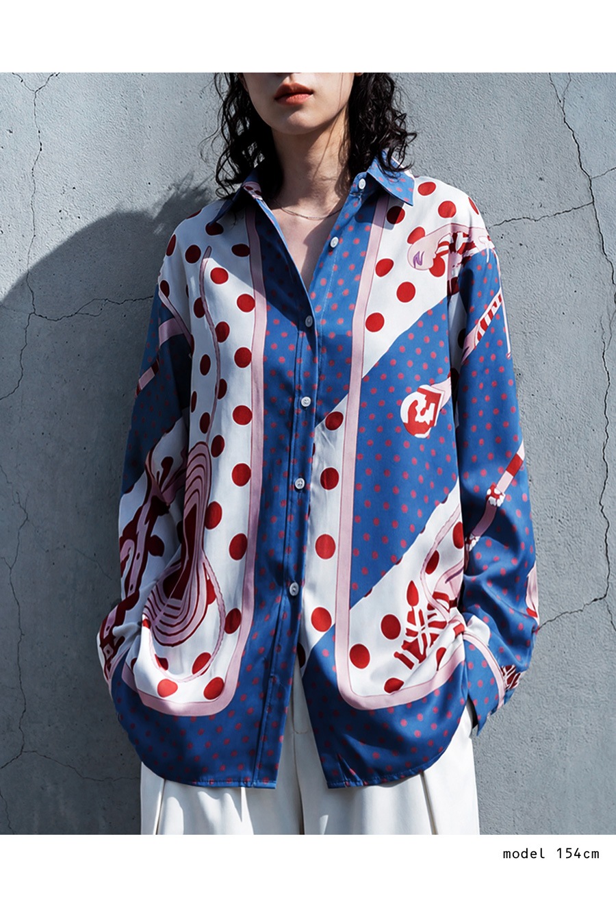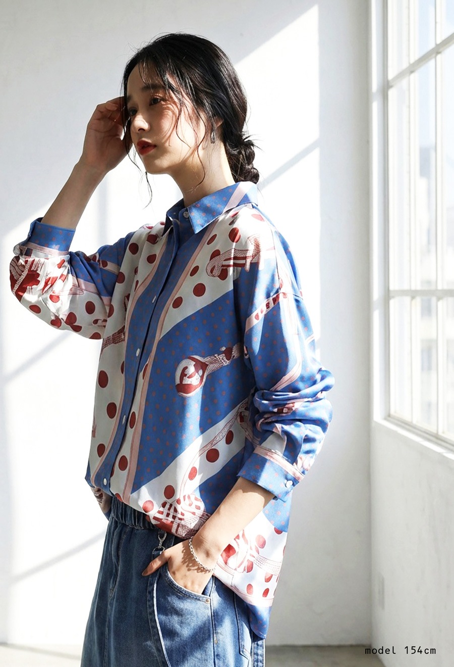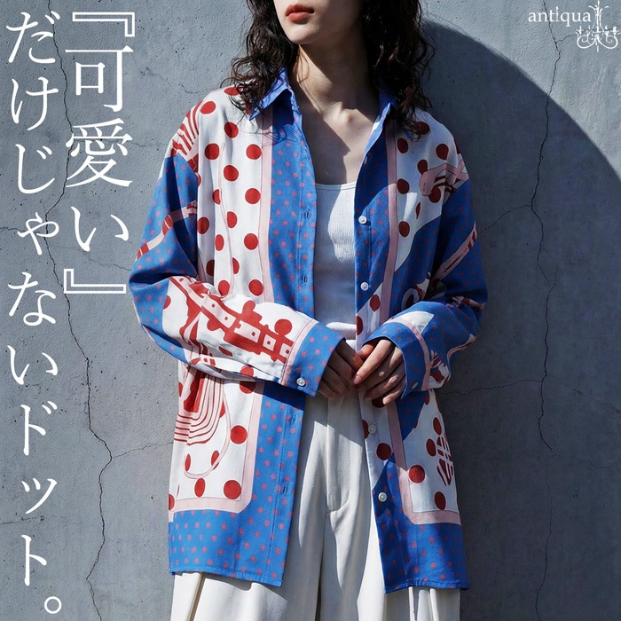 アート柄 ドット切替 シャツ レディース 長袖 前開き 送料無料・(50)メール便可