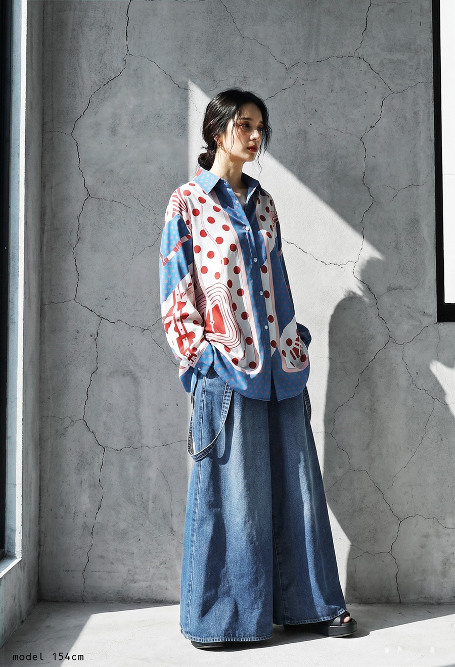 視線を奪うアート柄とドットの切替デザインが印象的な一枚です。