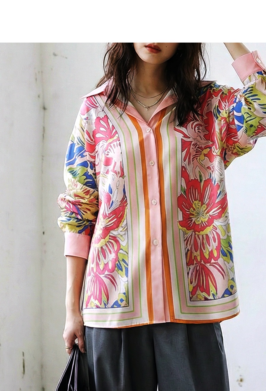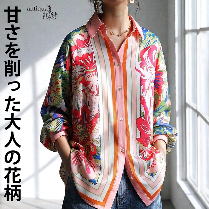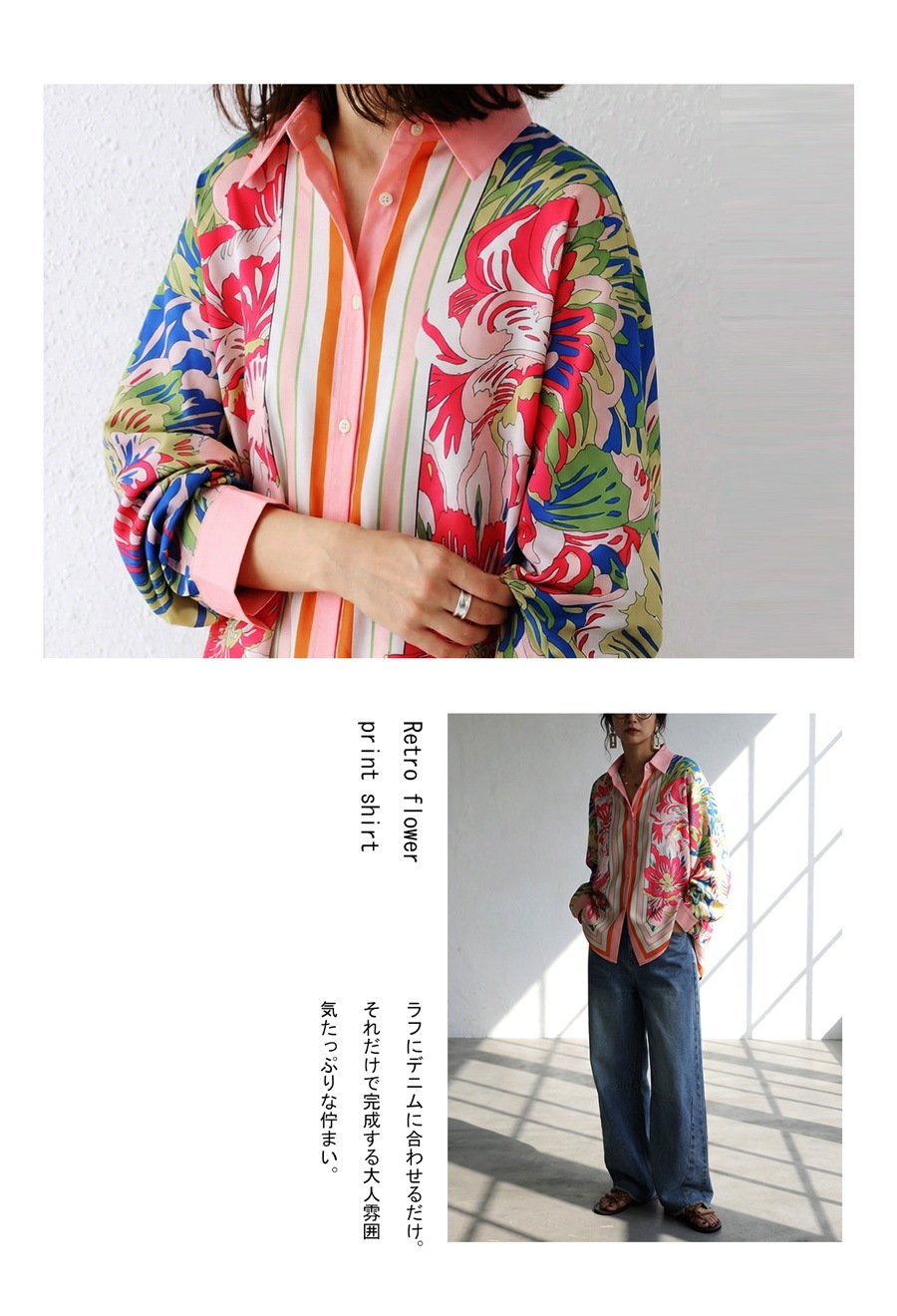 甘さを抑えた大人のレトロフラワー柄が目を惹く、存在感たっぷりのストライプ切替シャツ。