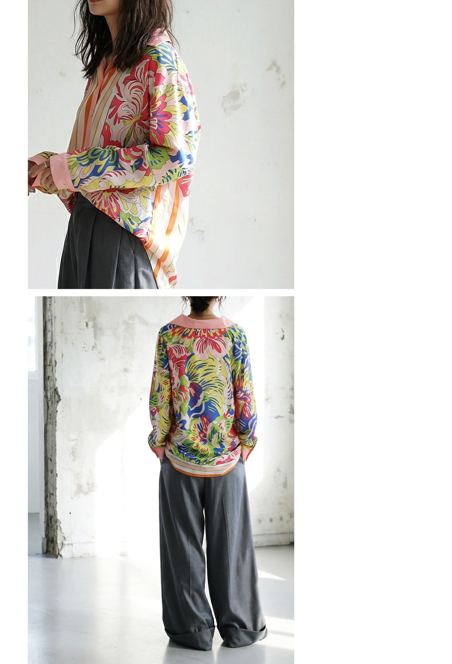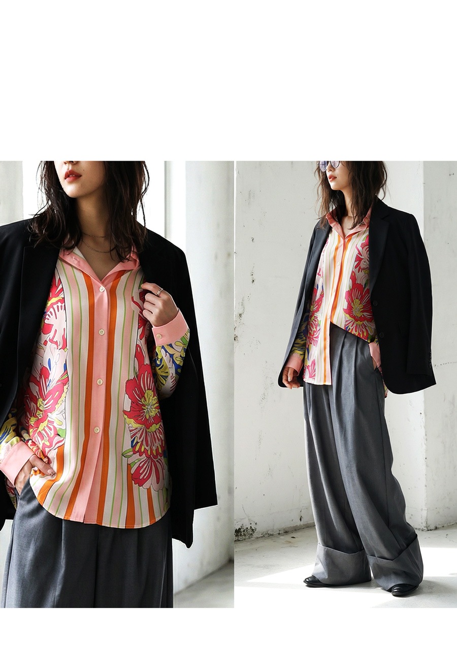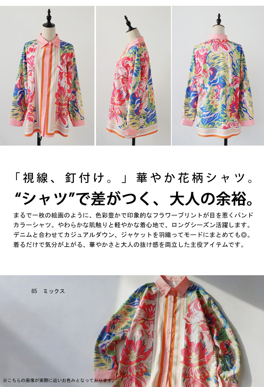 甘さを抑えた大人のレトロフラワー柄が目を惹く、存在感たっぷりのストライプ切替シャツ。