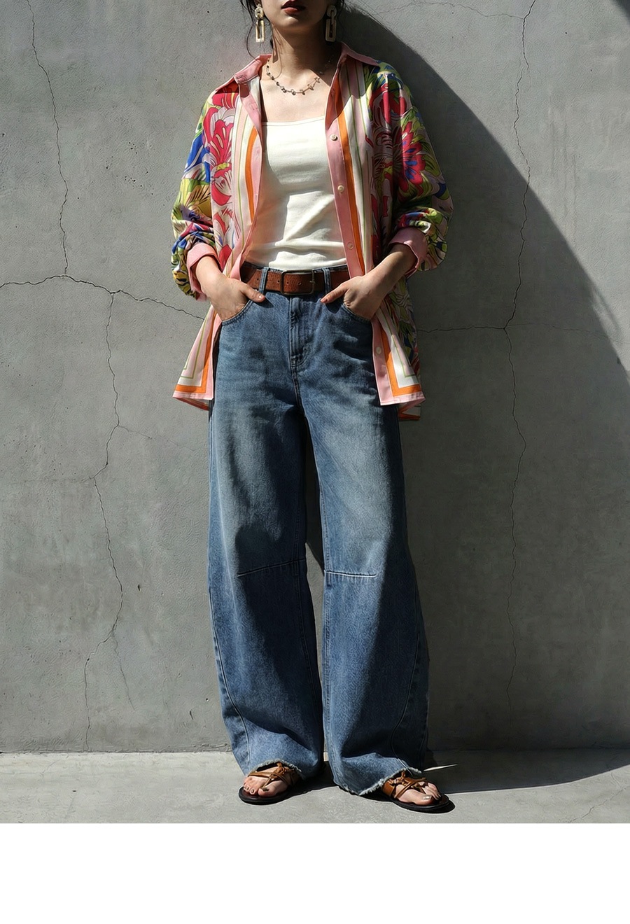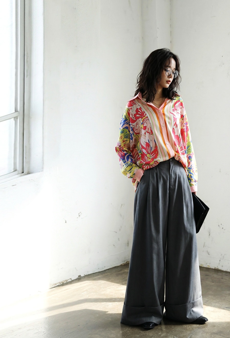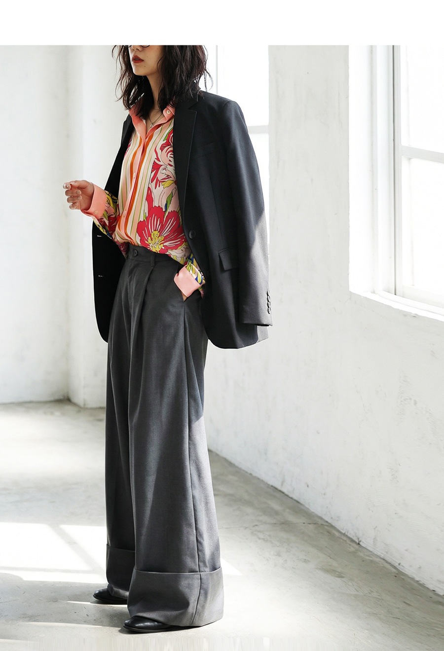 形状はビッグシルエットにドロップショルダーで、ゆるやかな落ち感のある抜け感スタイルに仕上げています。