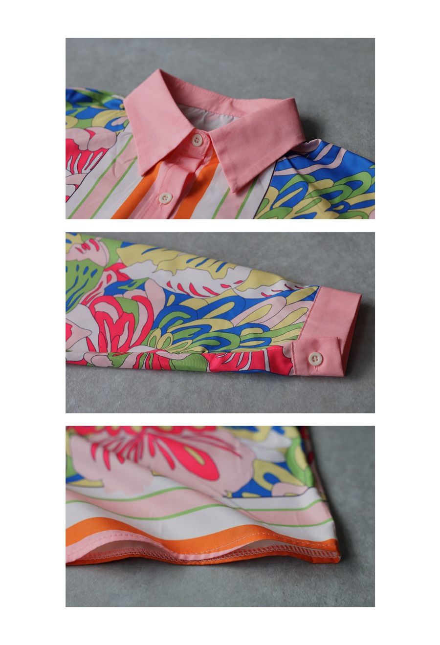 カラーはピンクをベースに、グリーン・オレンジ・ブルー・ホワイトなど華やかな配色が際立つ一枚です(桃・もも・ピンク、緑・みどり・グリーン、橙・だいだい・オレンジ、青・あお・ブルー、白・しろ・ホワイト)。
