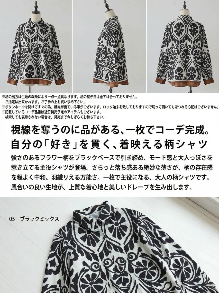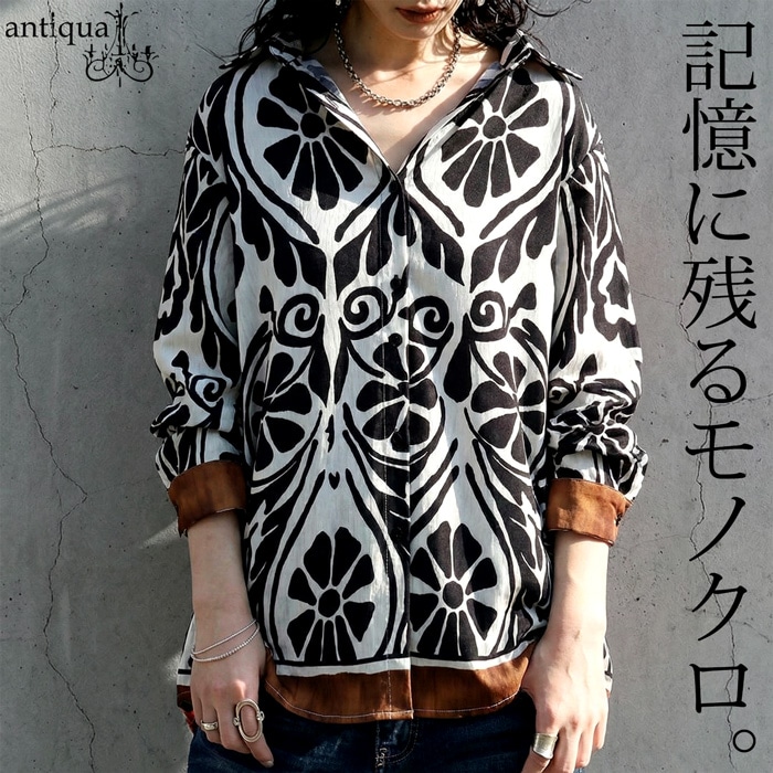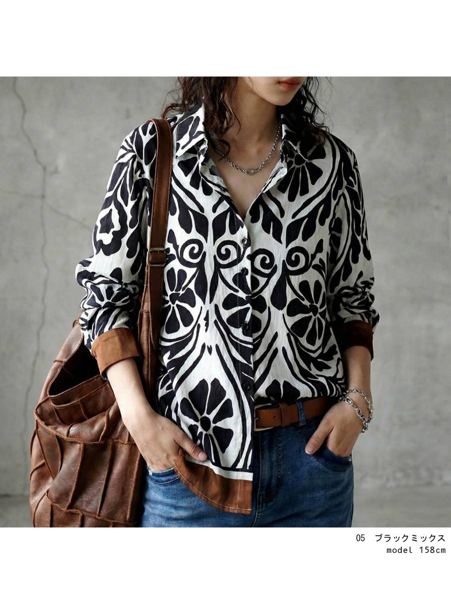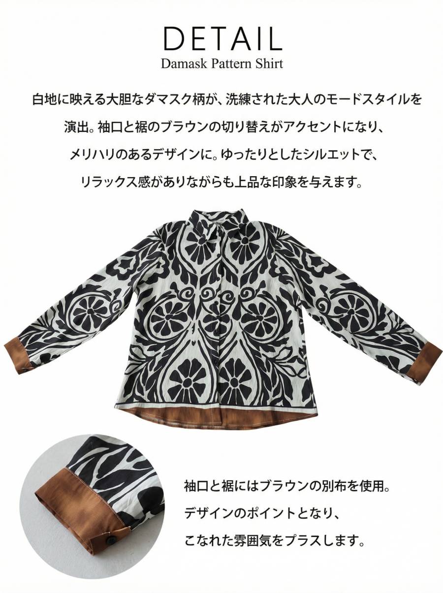 一枚で、完成する。ダマスク 柄シャツ レディース 長袖 レギュラーカラー 送料無料・(50)メール便可