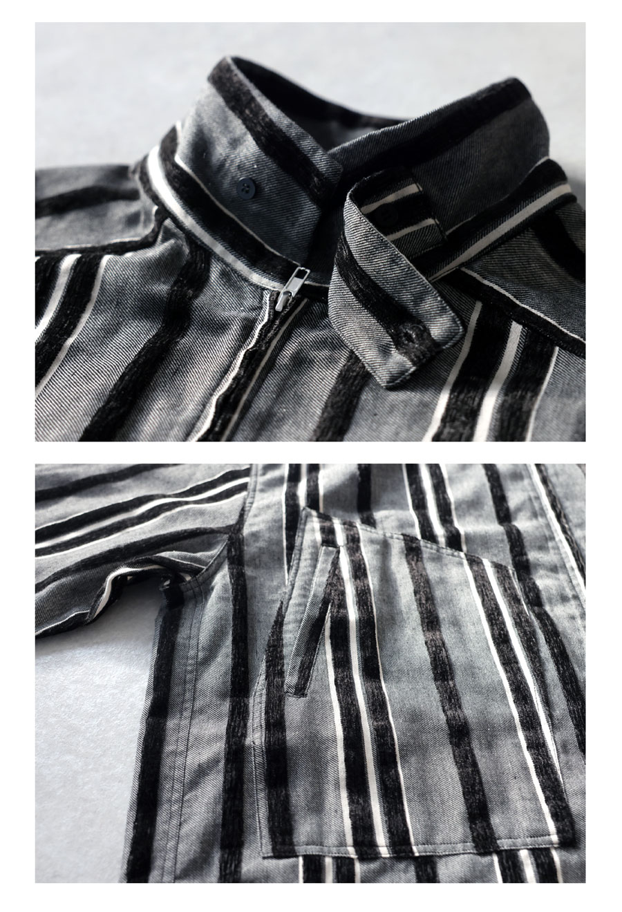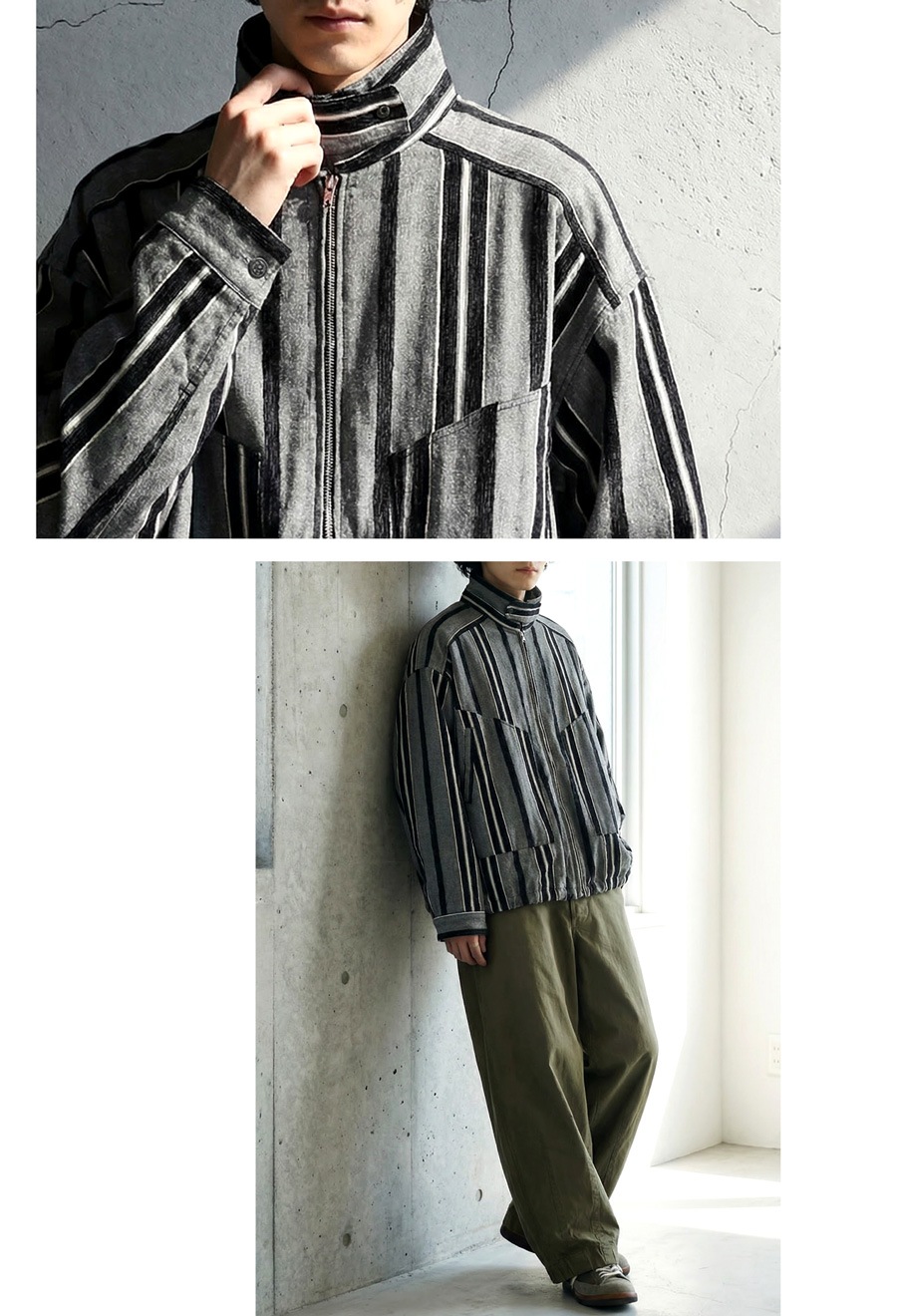 落ち着いた配色の縦ストライプが映える、綿100素材のスタンドカラーブルゾンです。