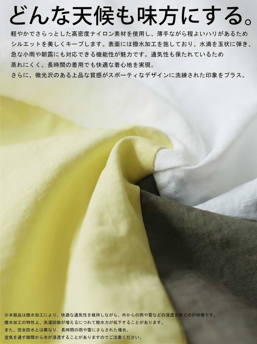 軽やかな着心地が魅力の軽量アウターで、さらっと羽織れるナイロンジャケットとしてラウンドからデイリーまで活躍します。
