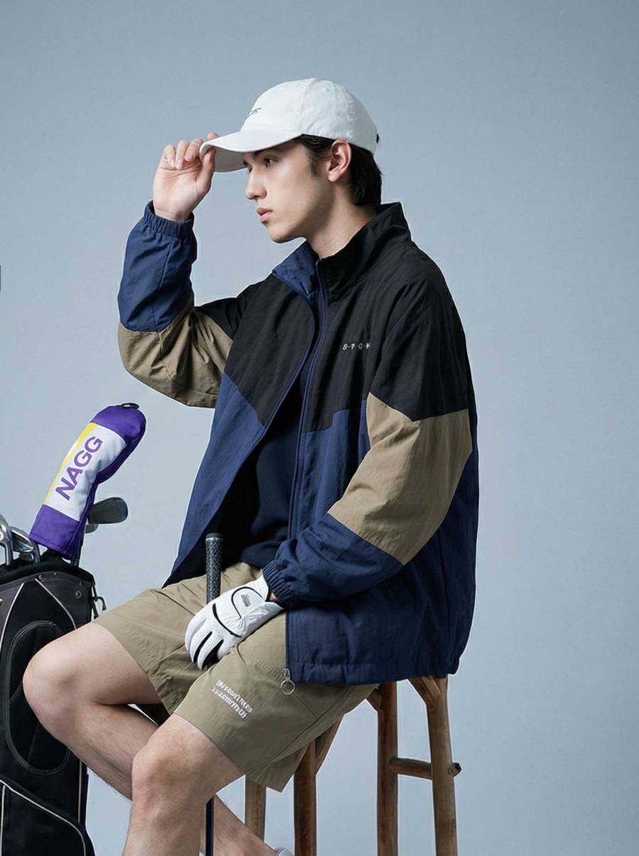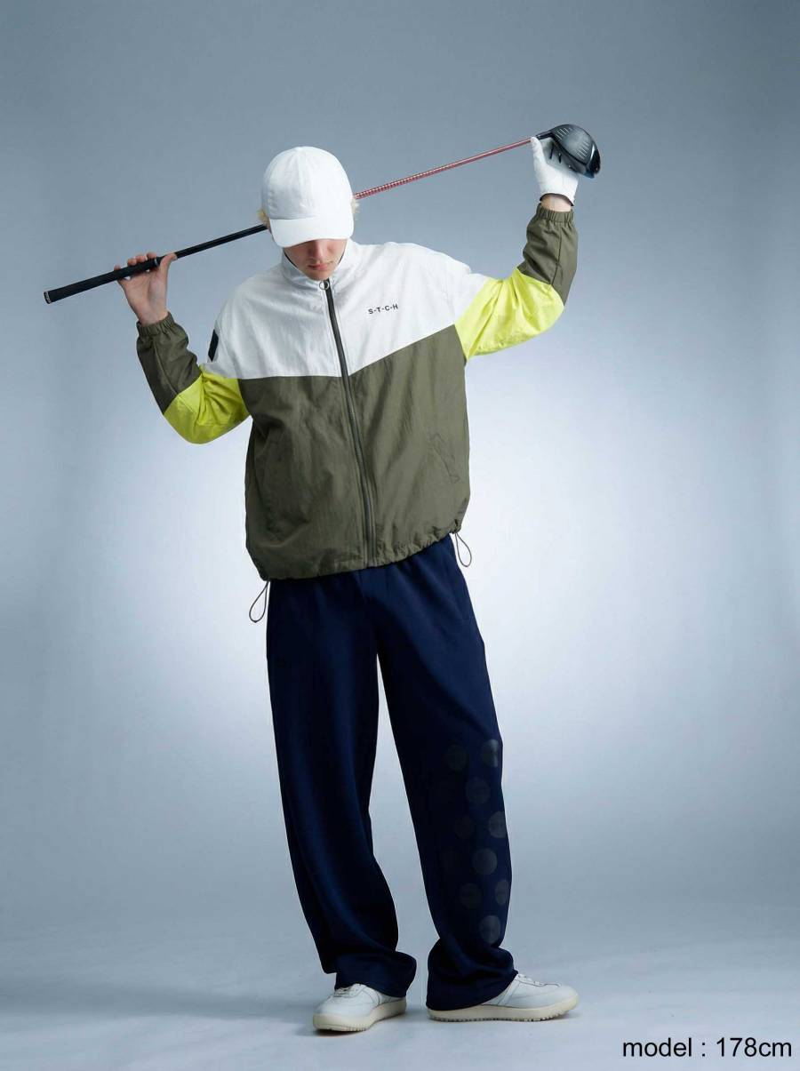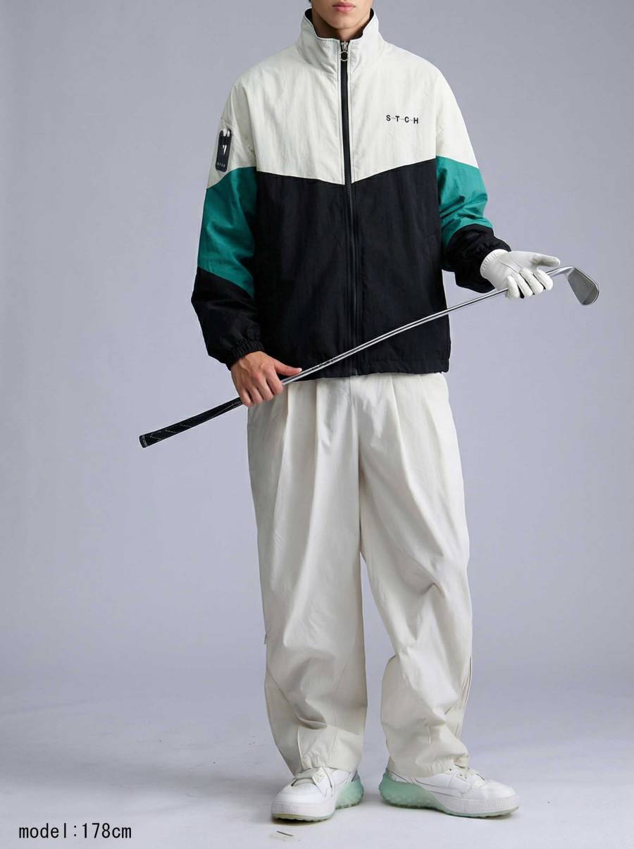 無地ベースに配色を効かせたブルゾンデザインで、スポーティながらきれいめな雰囲気もあり、メンズゴルフコーデにも取り入れやすい一着。