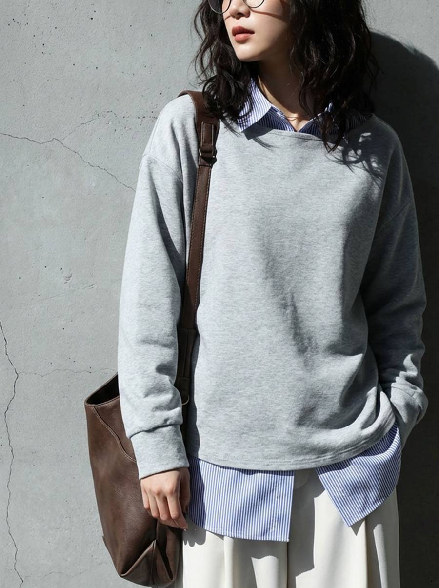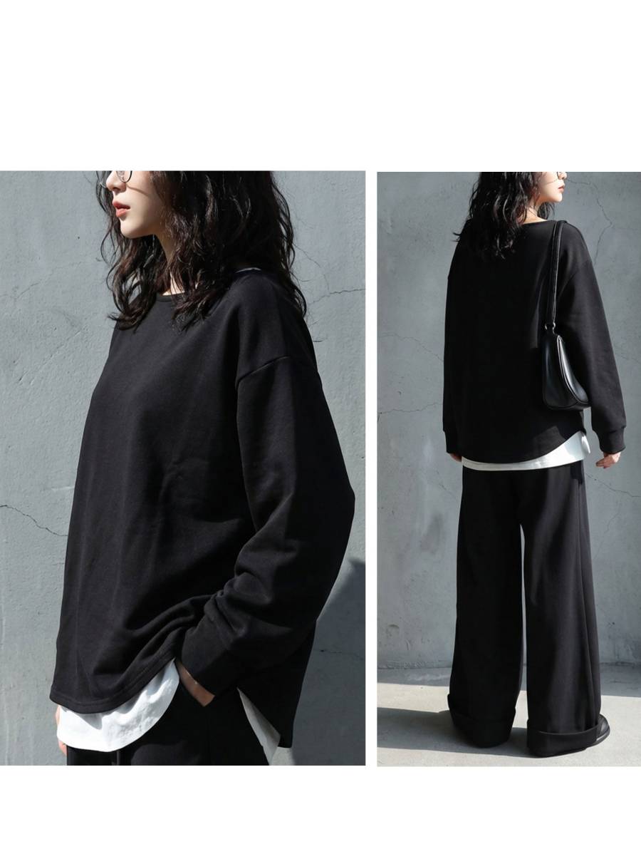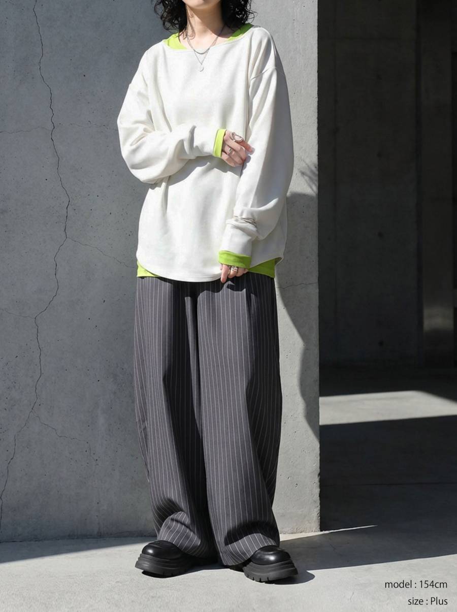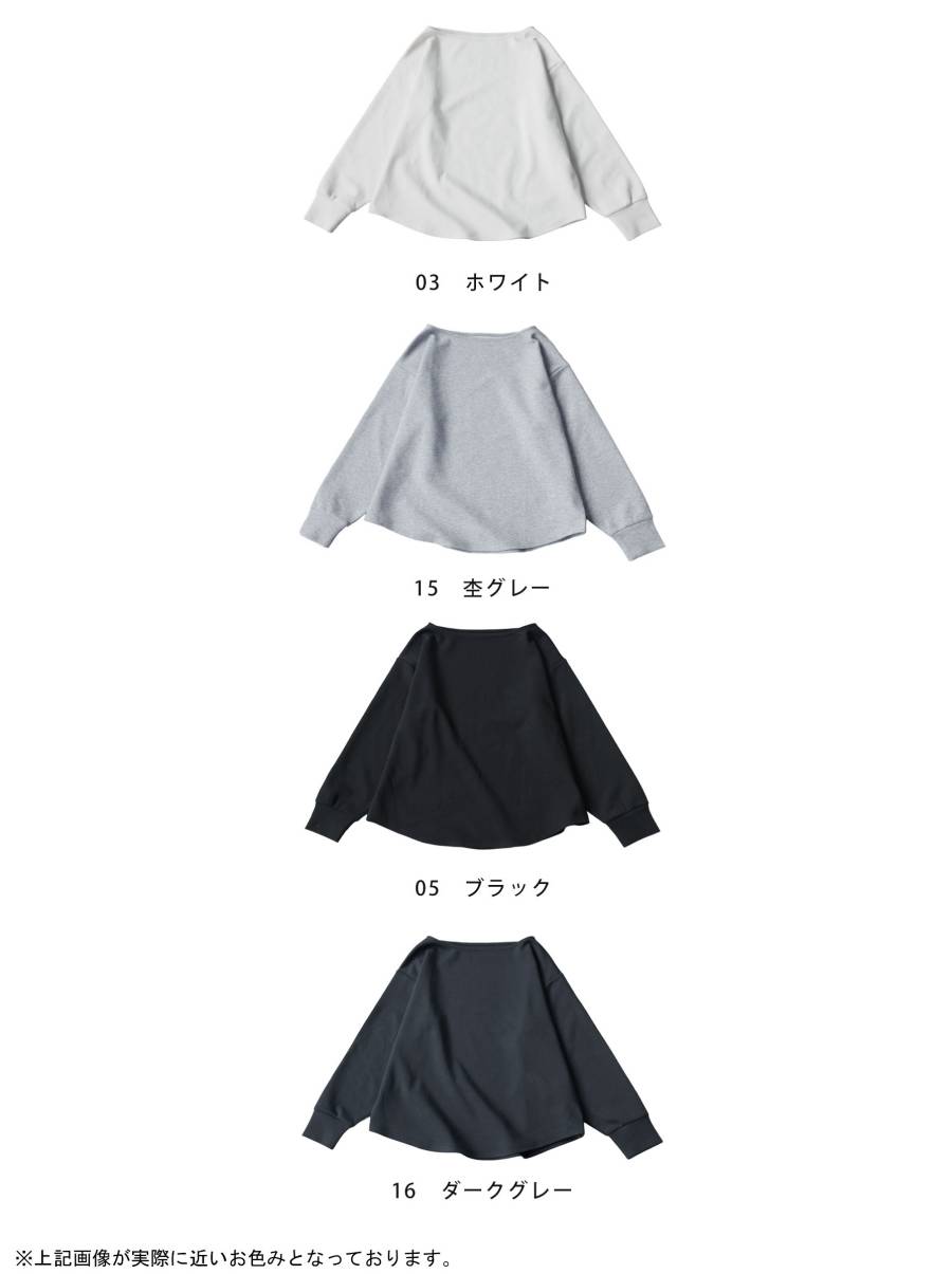 袖丈は長袖で、袖口はリブではなく共布仕様にすることでカジュアルになりすぎない仕上がりです。