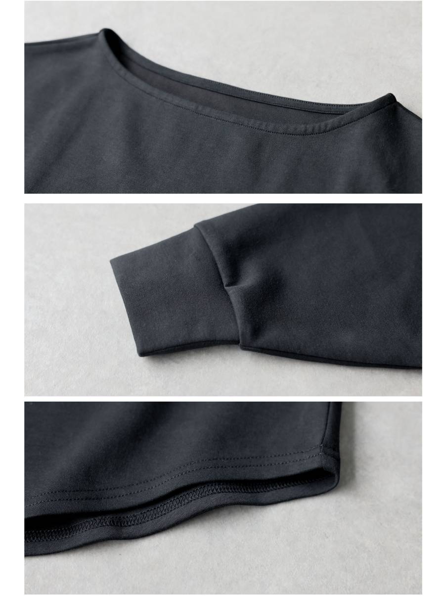 スーパーボートネック仕様のネックラインが首元を美しく見せ、女性らしい印象を演出します。