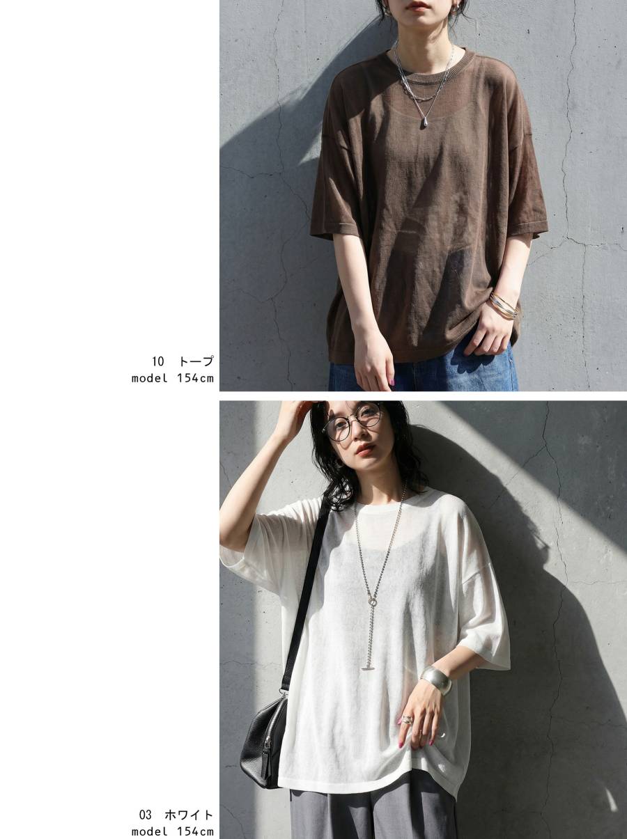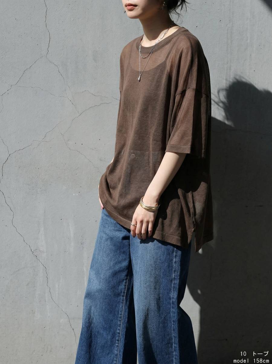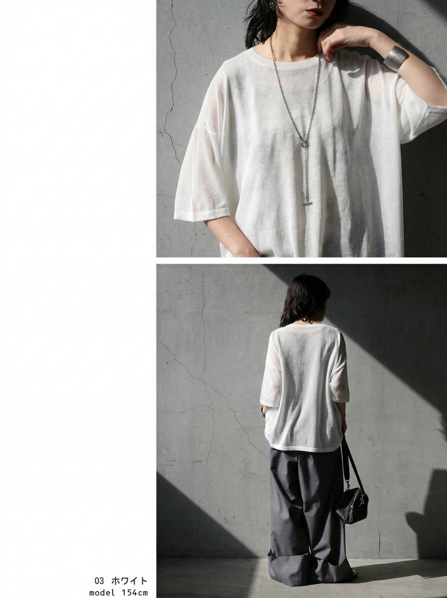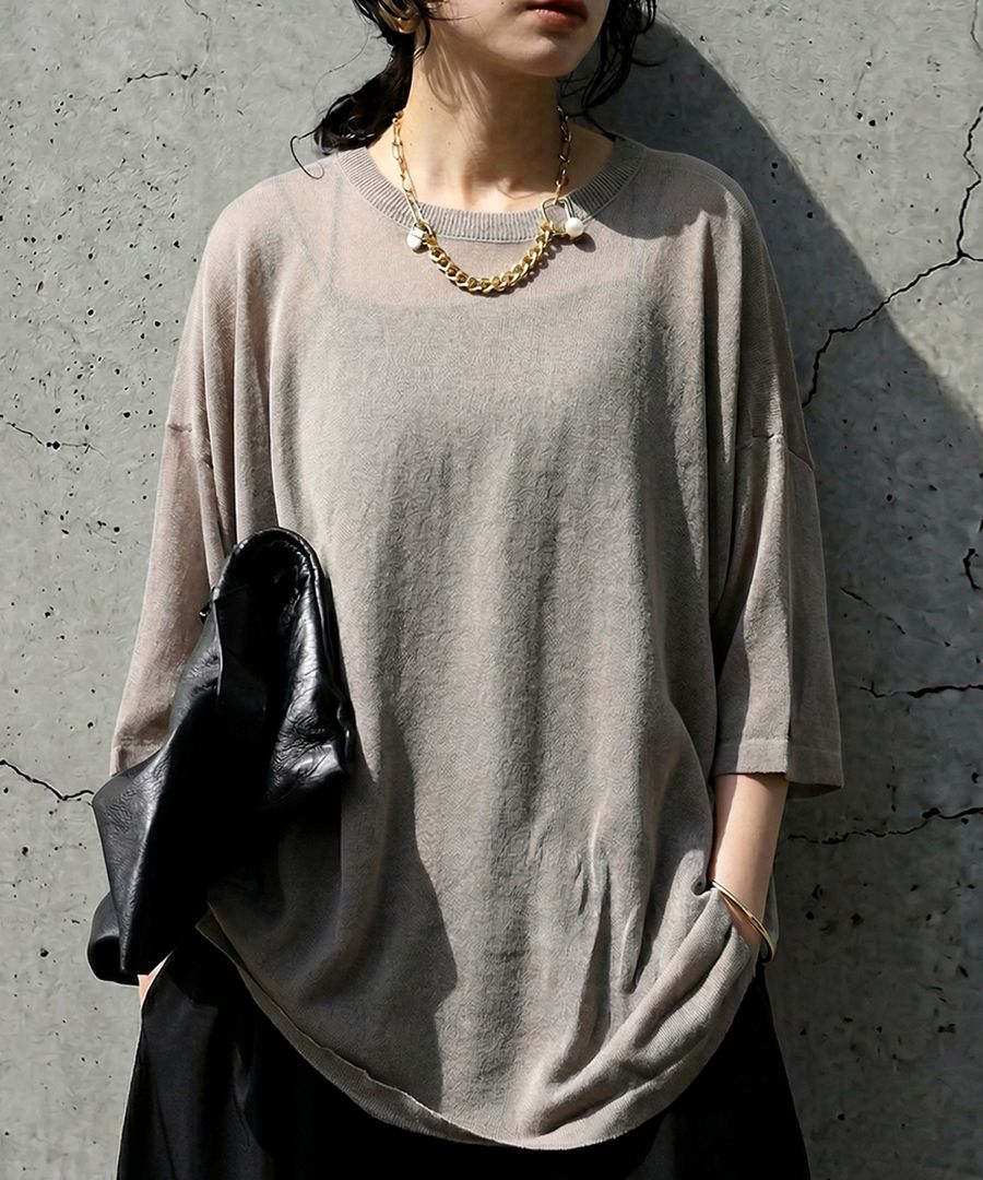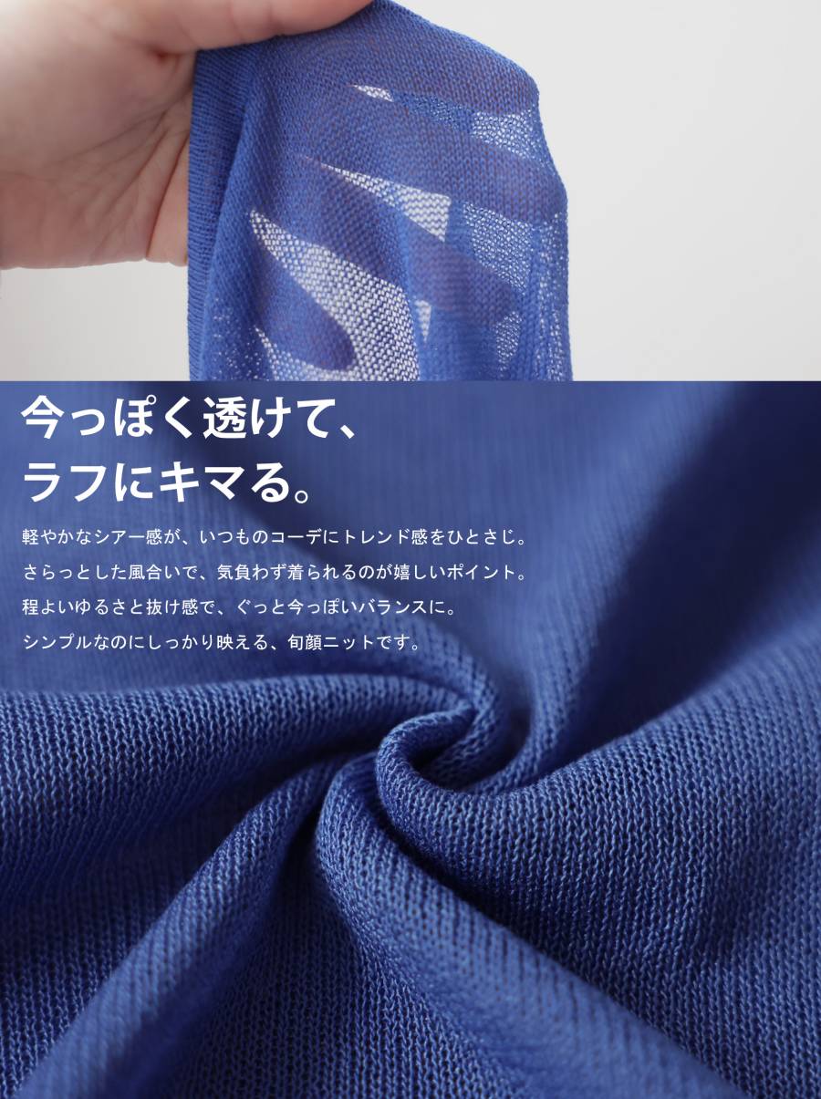 ハイゲージで丁寧に編み上げた生地が、繊細な透け感と軽やかな着心地を叶え、抜け感のある上品な印象に仕上げます。