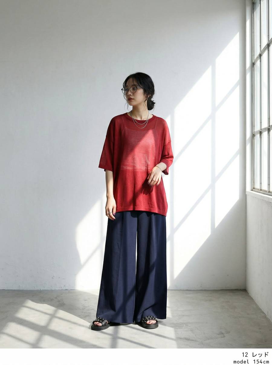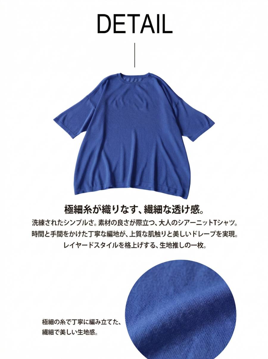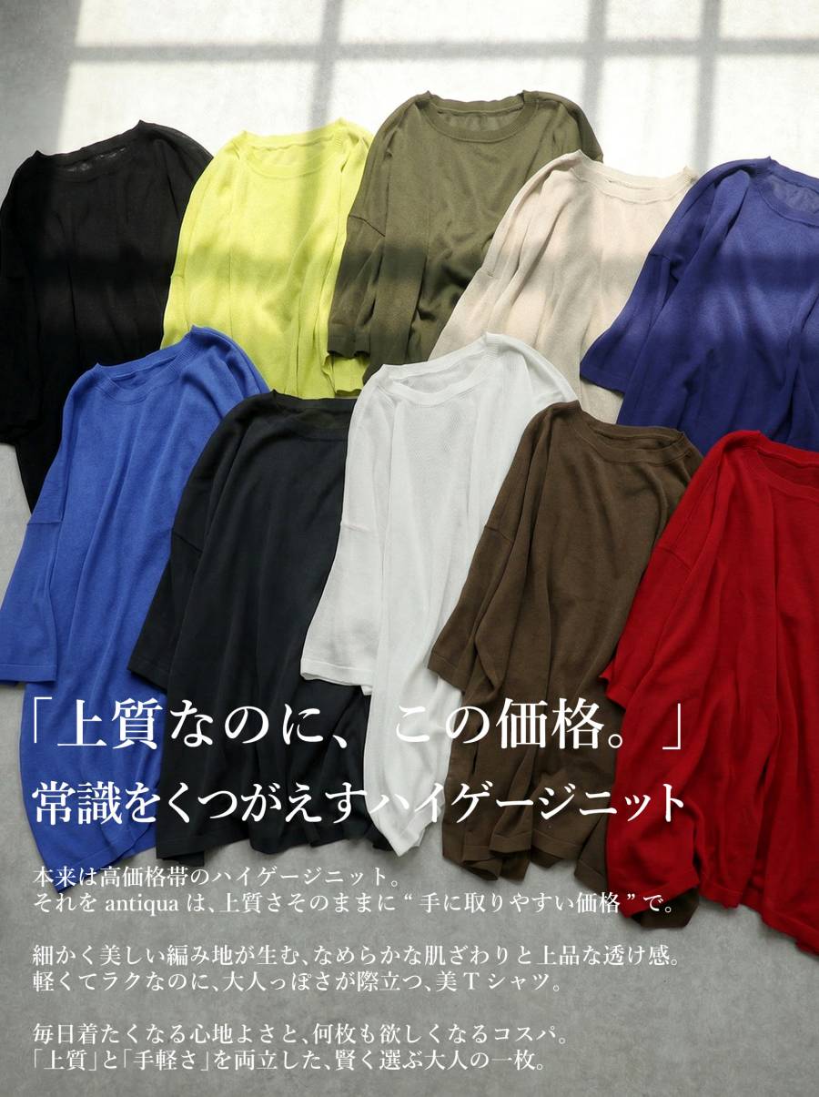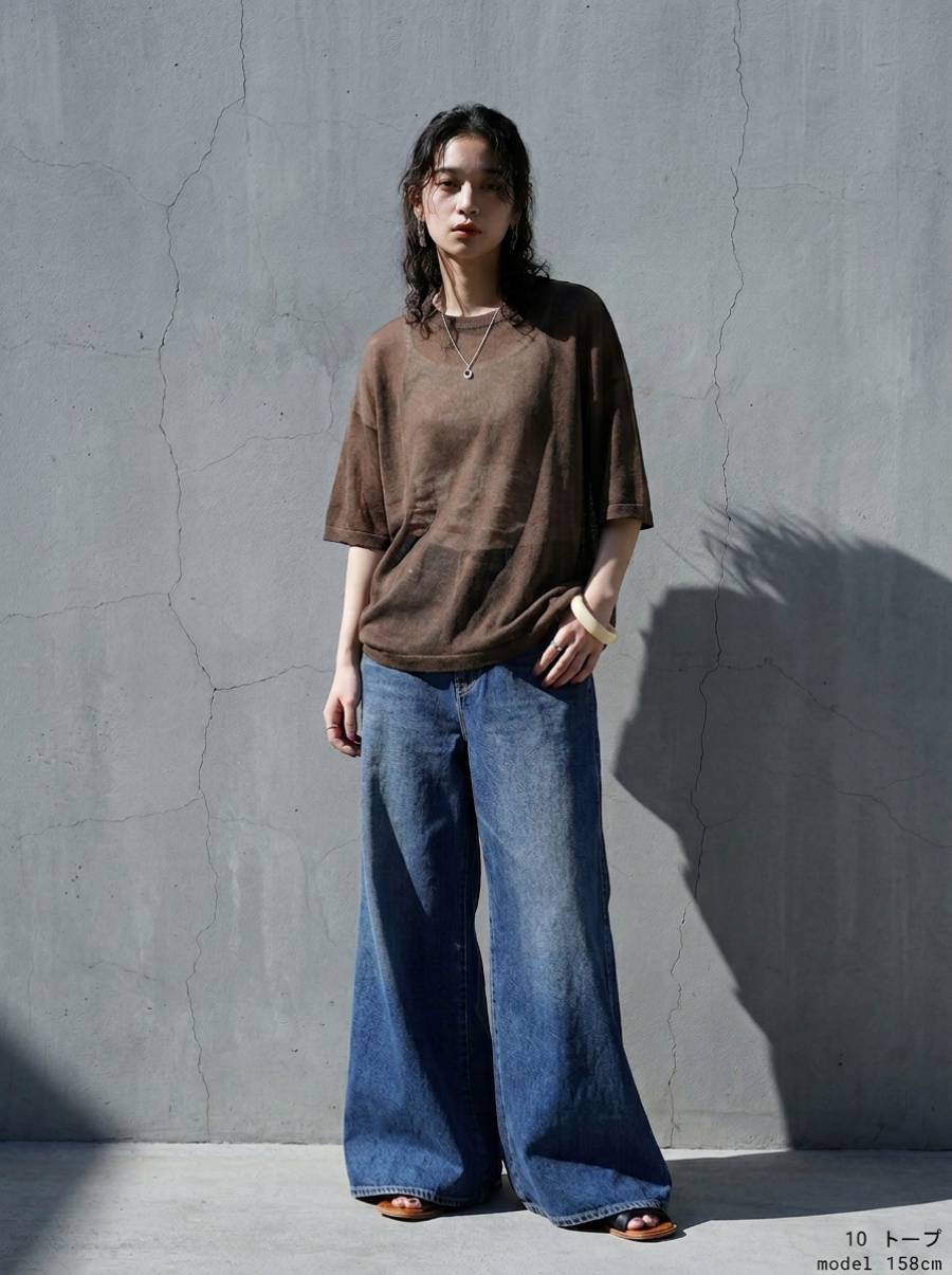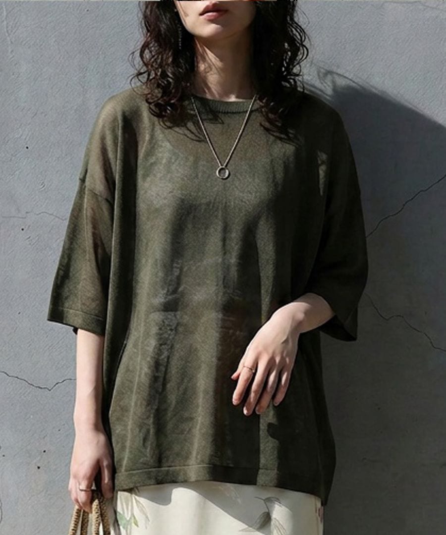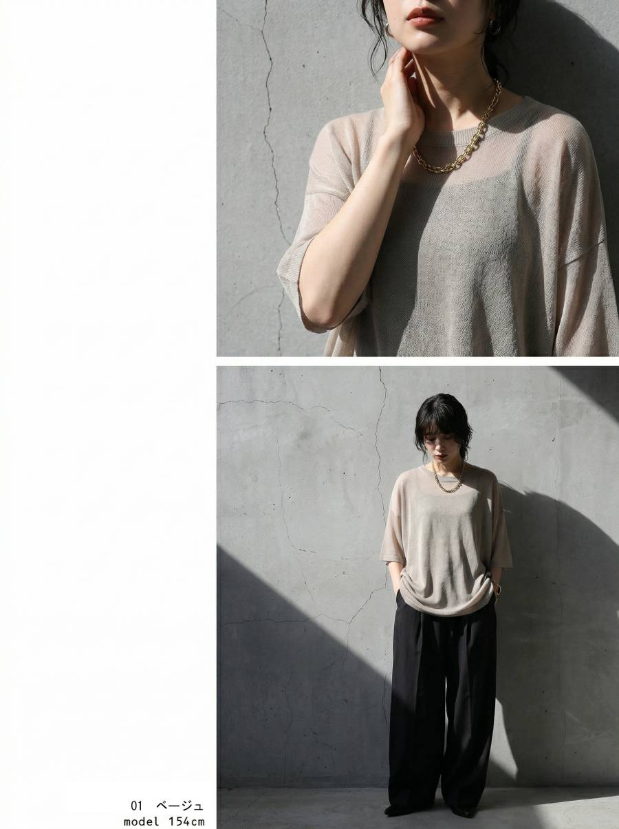 ハイゲージで丁寧に編み上げた生地が、繊細な透け感と軽やかな着心地を叶え、抜け感のある上品な印象に仕上げます。