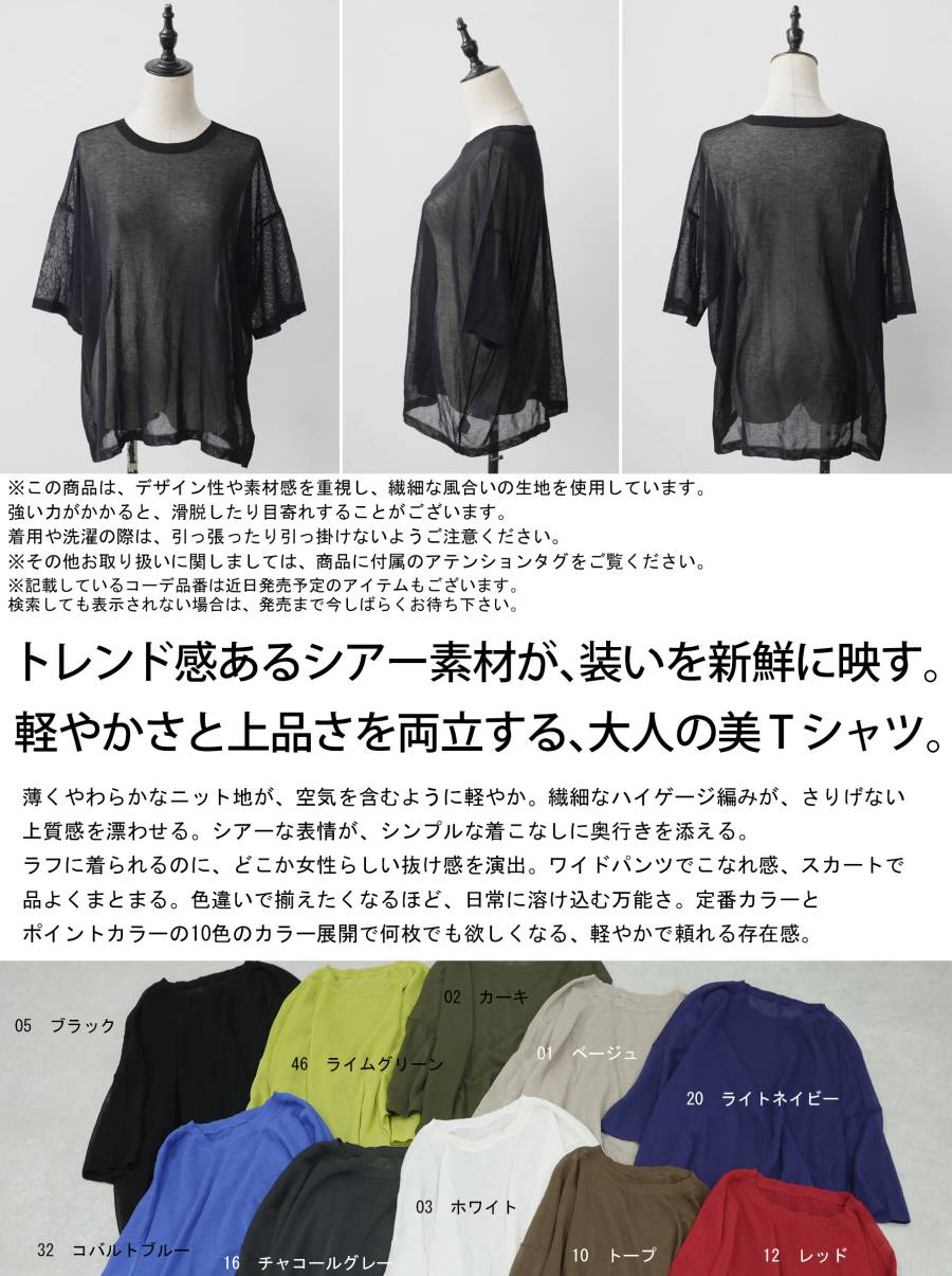 透け盛れ シアーニット レディース 半袖 無地 Tシャツ クルーネック・(50)メール便可