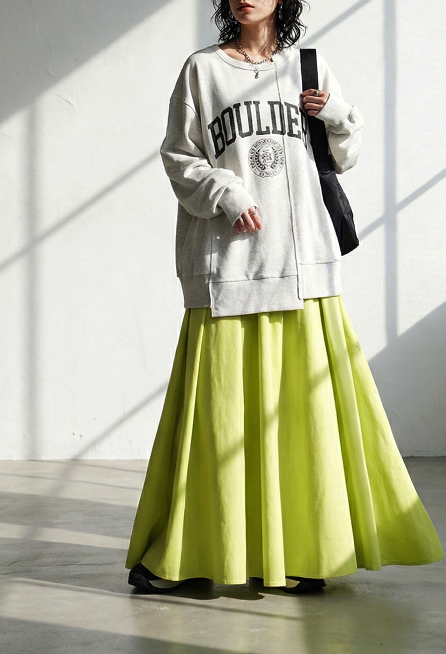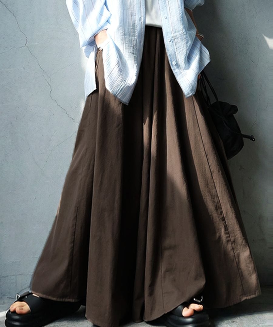 丈感は足首まで届くマキシ丈で、動くたびに揺れるシルエットが体型カバーを後押しします。