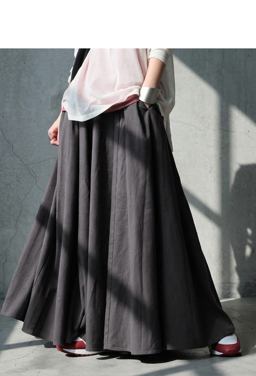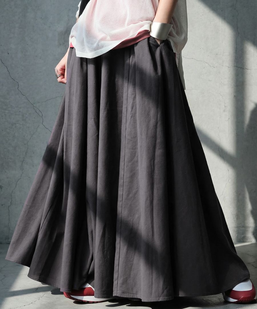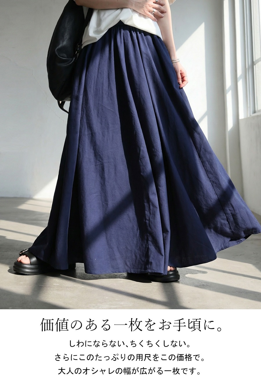 生地をたっぷりと使用し、美しく広がるAラインシルエットが印象的なリネン混素材のロングスカートです。