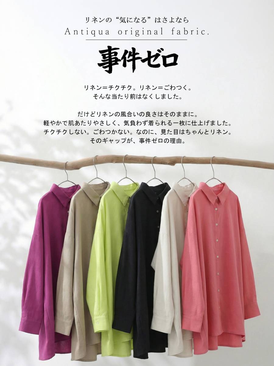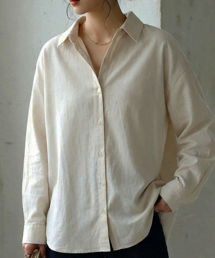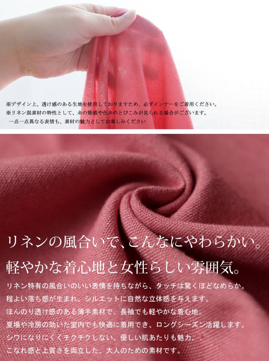 ほんのり透け感のあるリネン素材と麻混ならではのナチュラルな表情が、シンプルながらも上品な雰囲気を演出します。