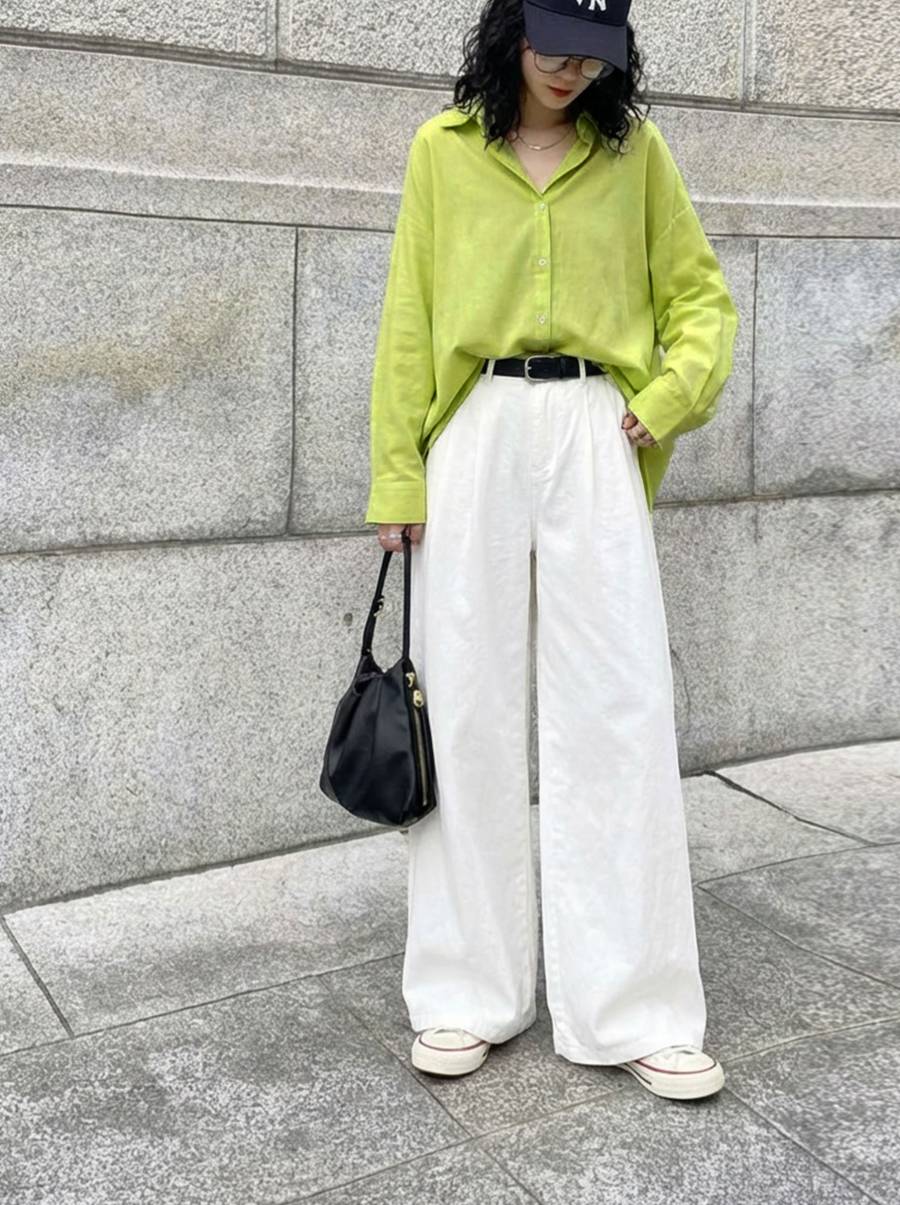 無地デザインだからこそ着回し力が高く、デニム合わせのナチュラルスタイルからオフィスカジュアルまで幅広く対応します。