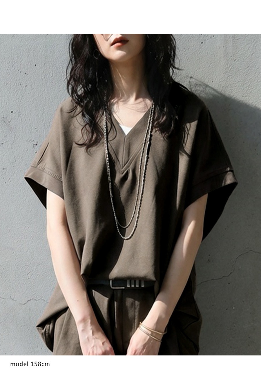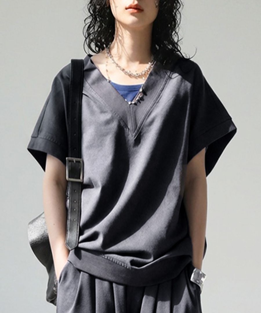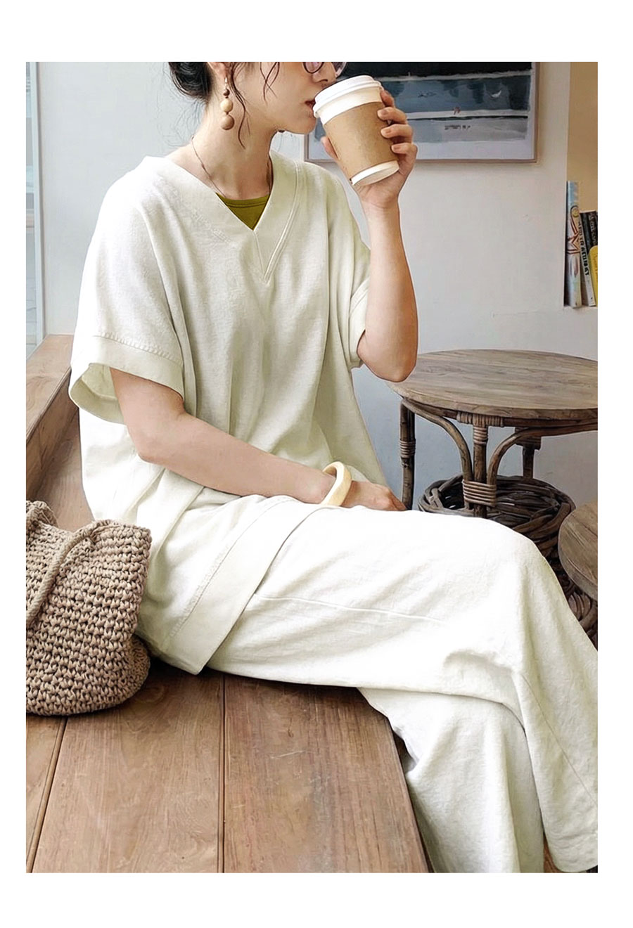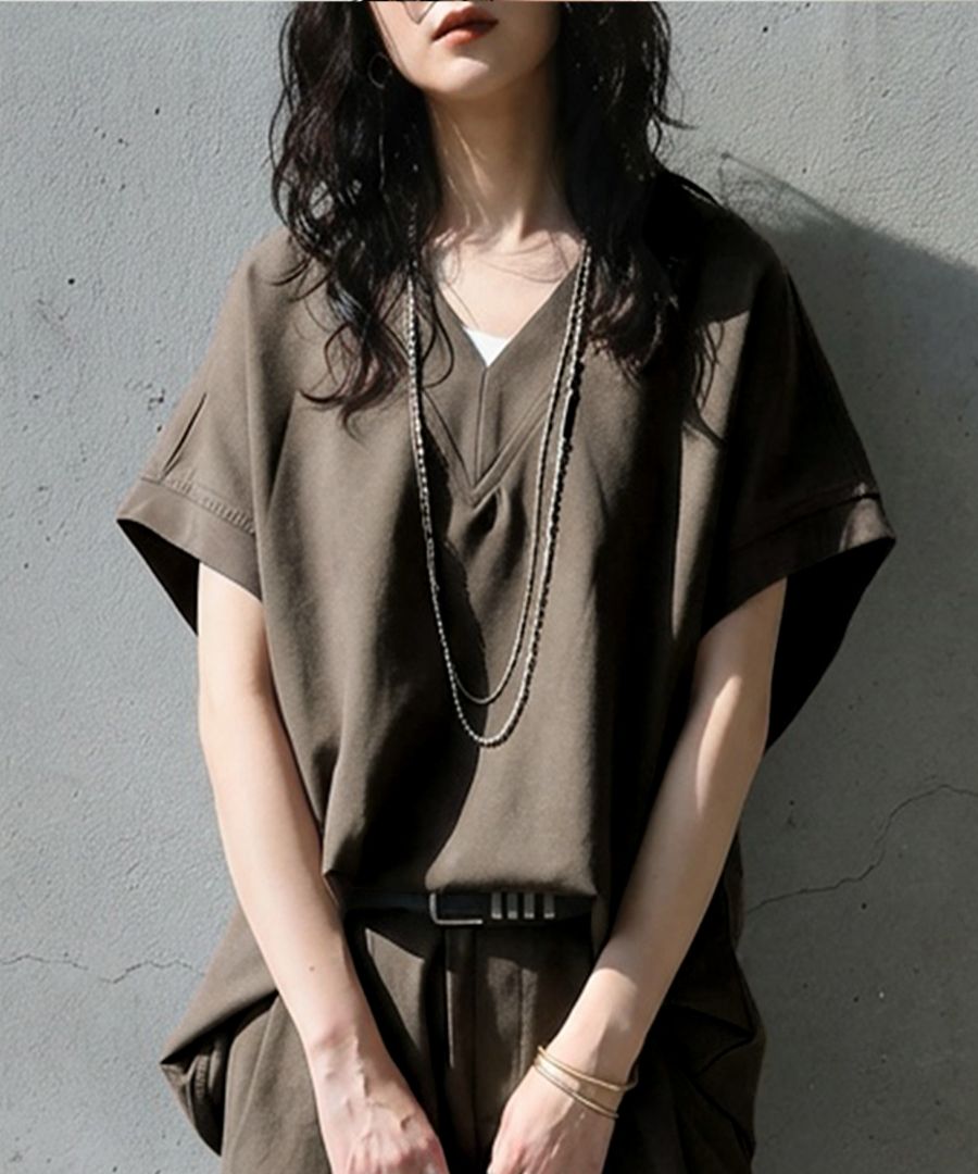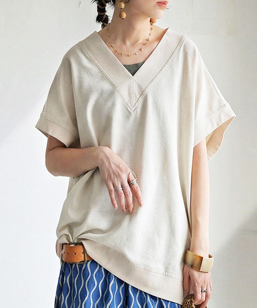 顔まわりをすっきり見せるVネックラインと、肩が落ちるドロップショルダーが抜け感を演出します。
