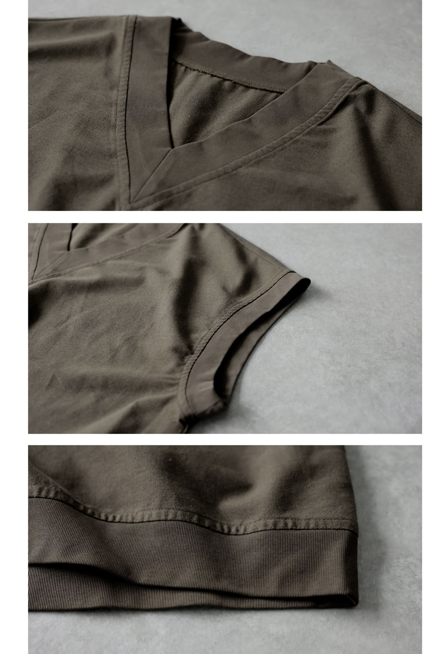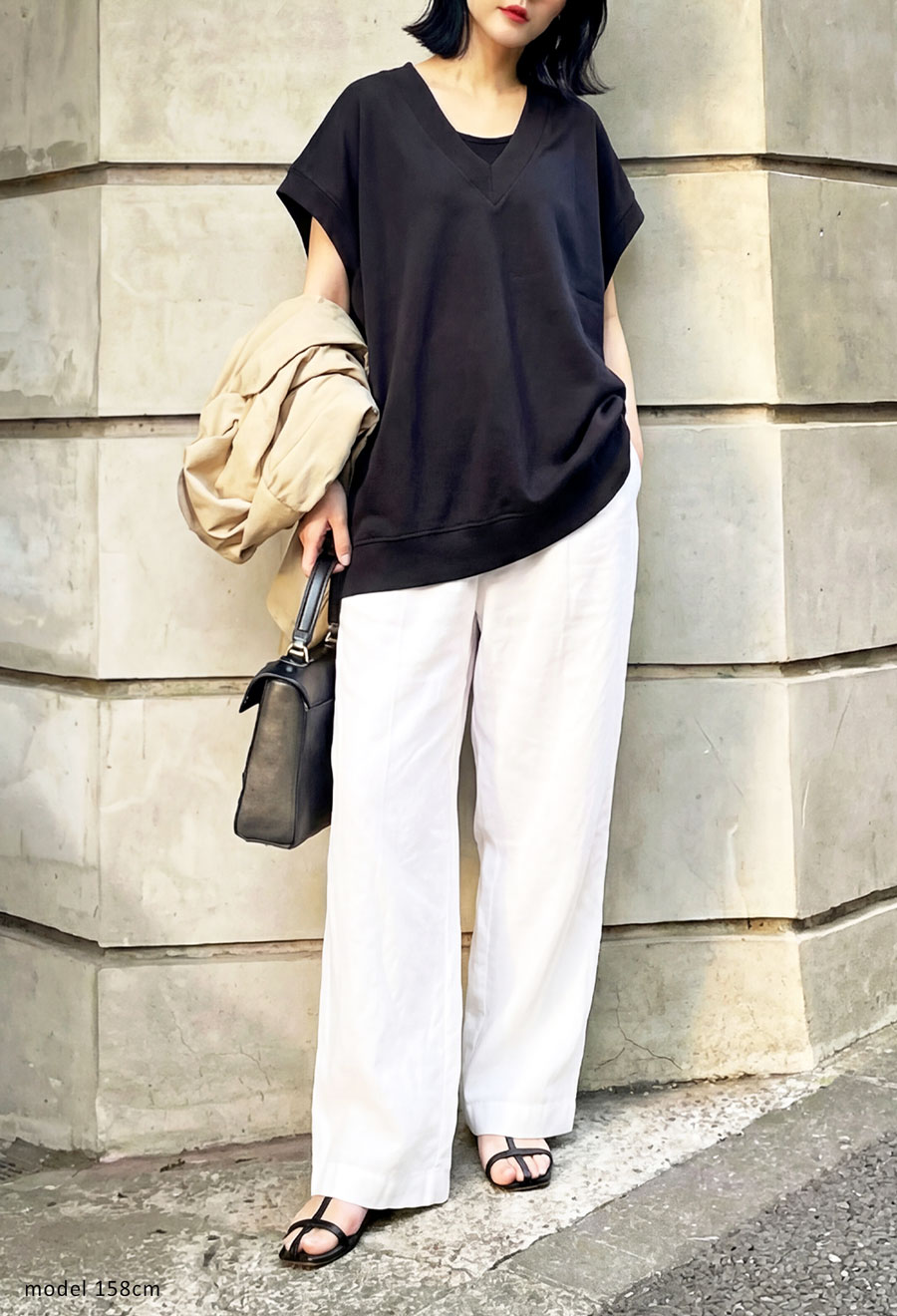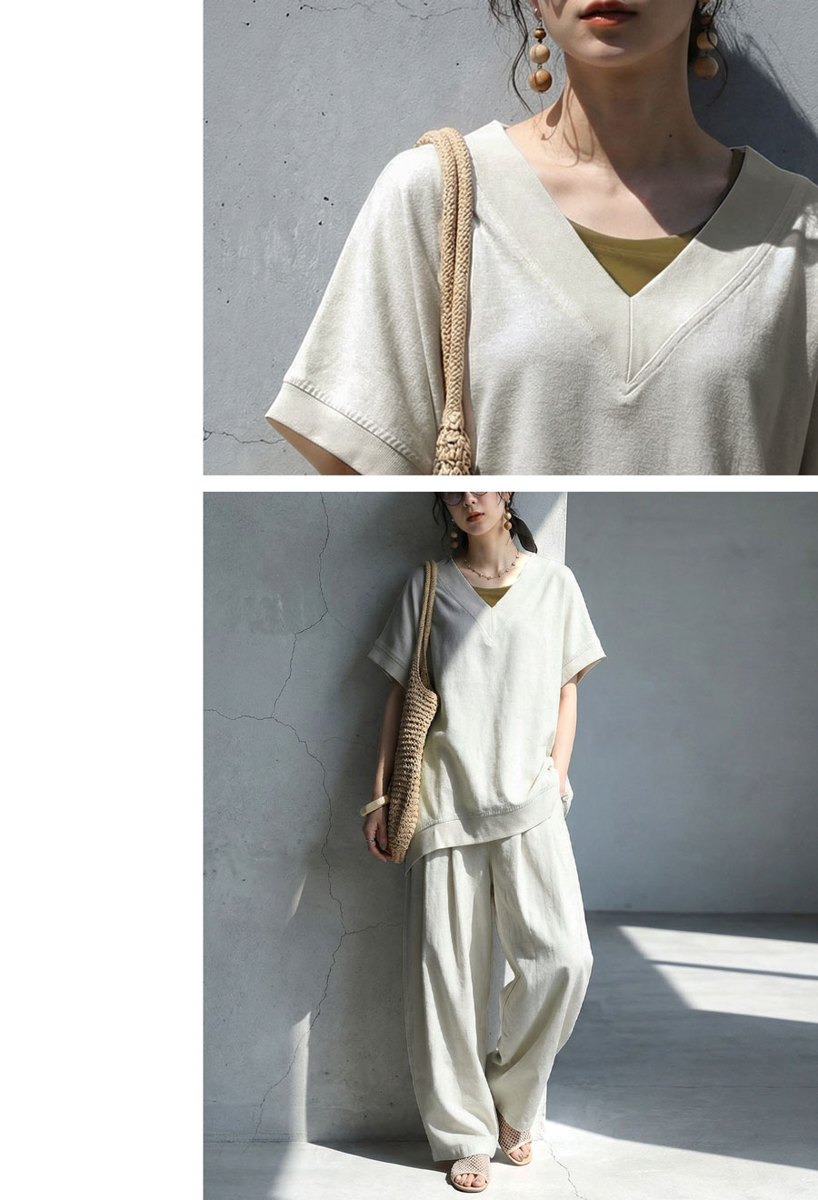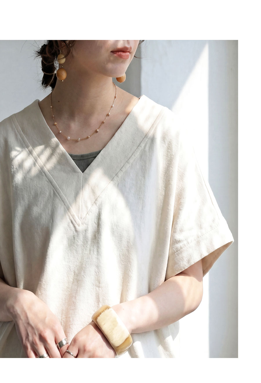 顔まわりをすっきり見せるVネックラインと、肩が落ちるドロップショルダーが抜け感を演出します。