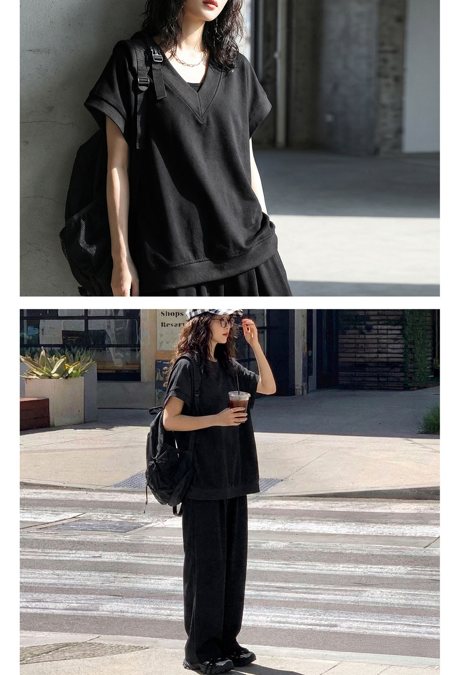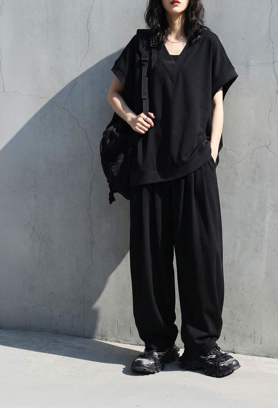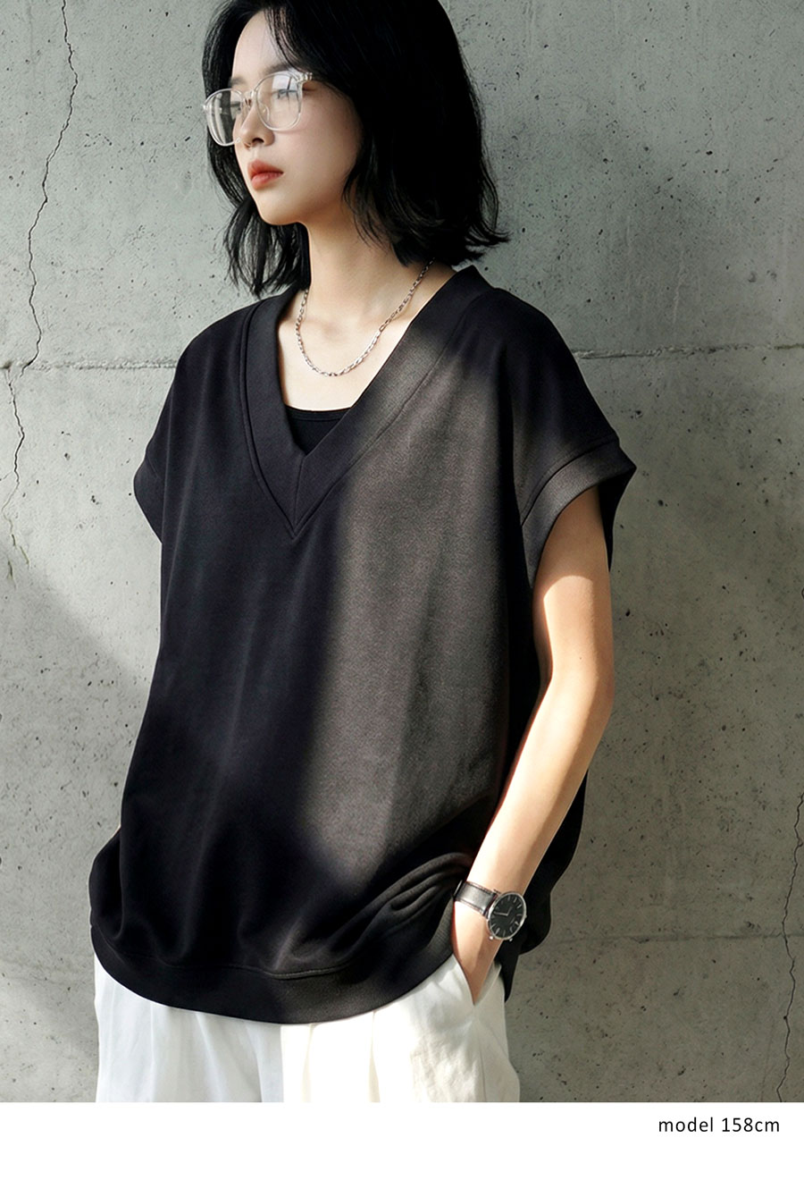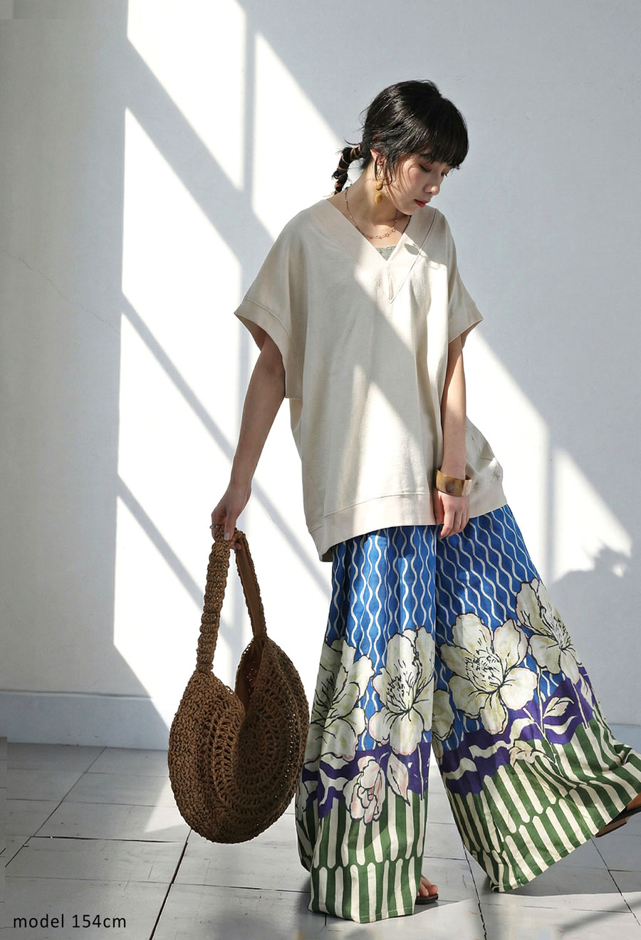 顔まわりをすっきり見せるVネックラインと、肩が落ちるドロップショルダーが抜け感を演出します。