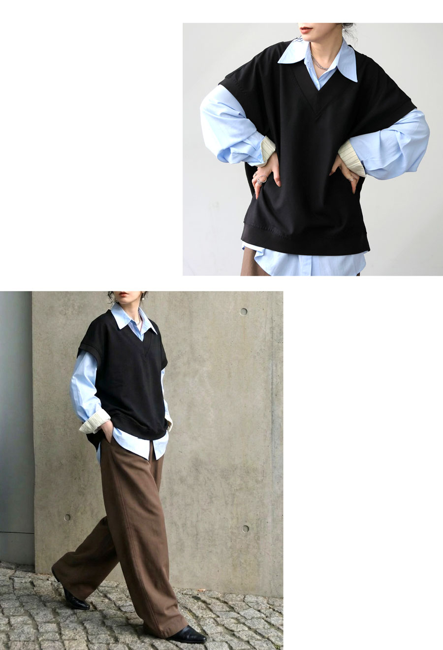 丈感はヒップにかかる長さで、重ね着やレイヤードスタイルにもバランスよく合わせやすいデザインです。