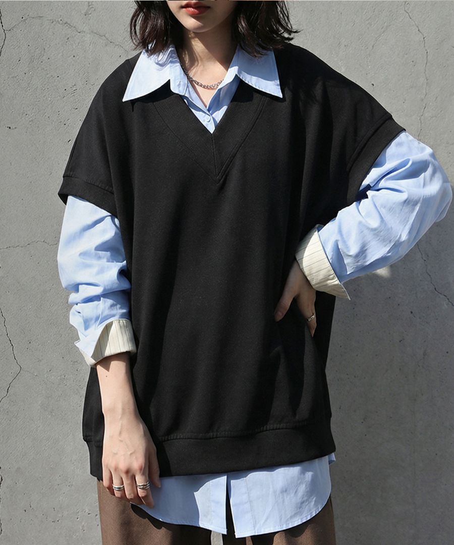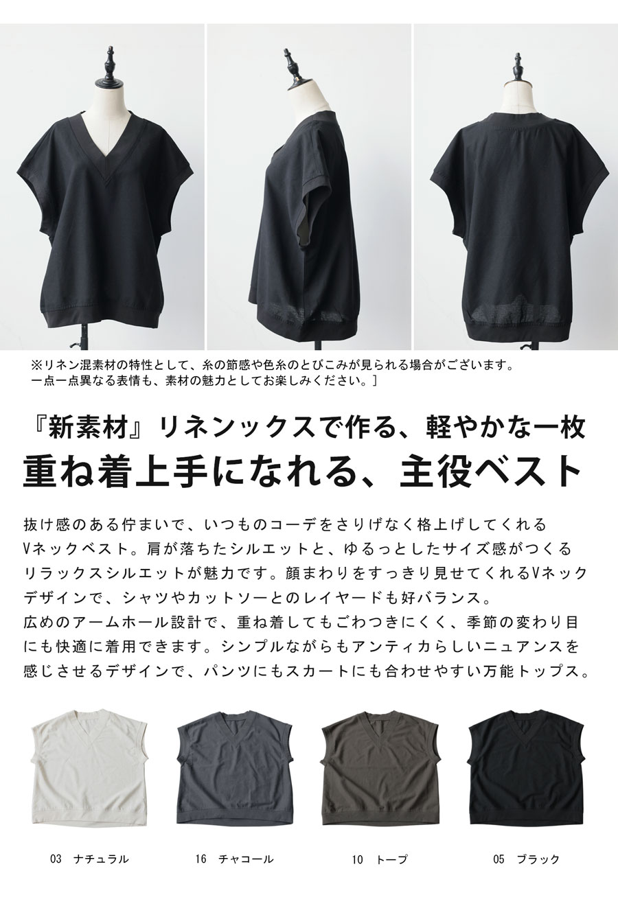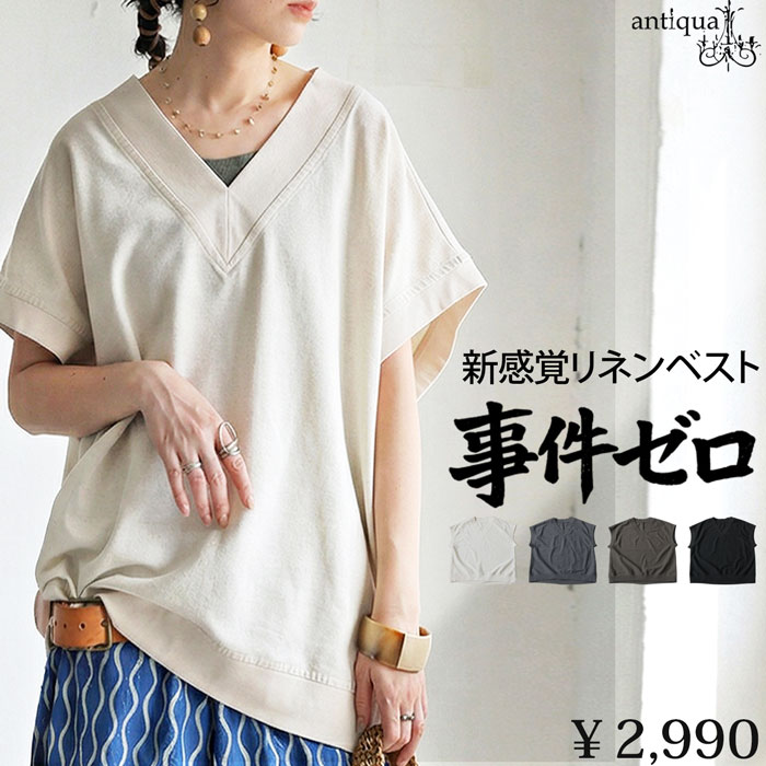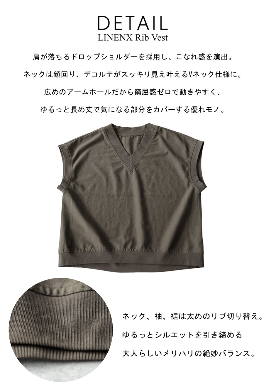 リネン混 Vネック 無地 ベスト レディース ルーズ・(500)メール便可