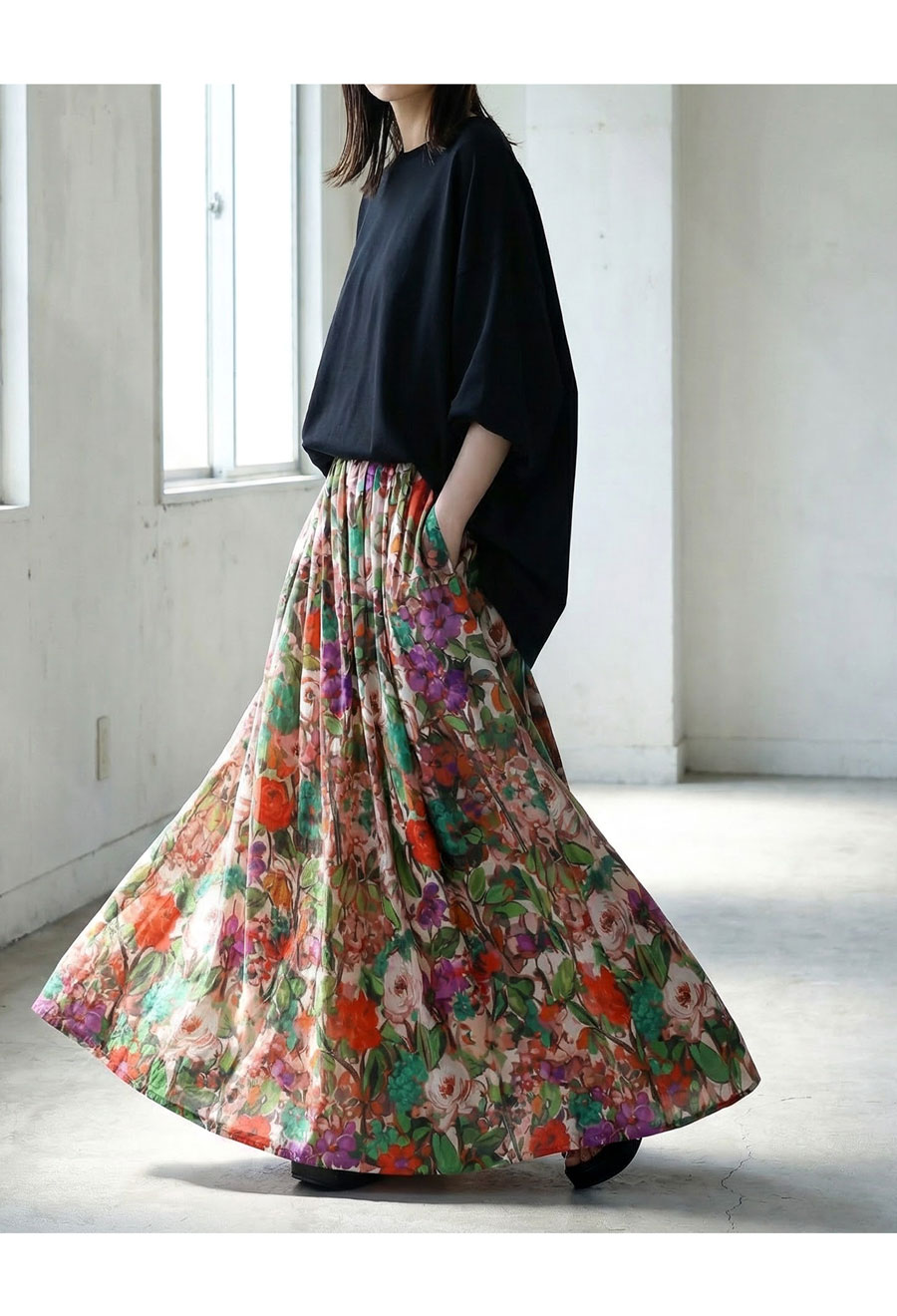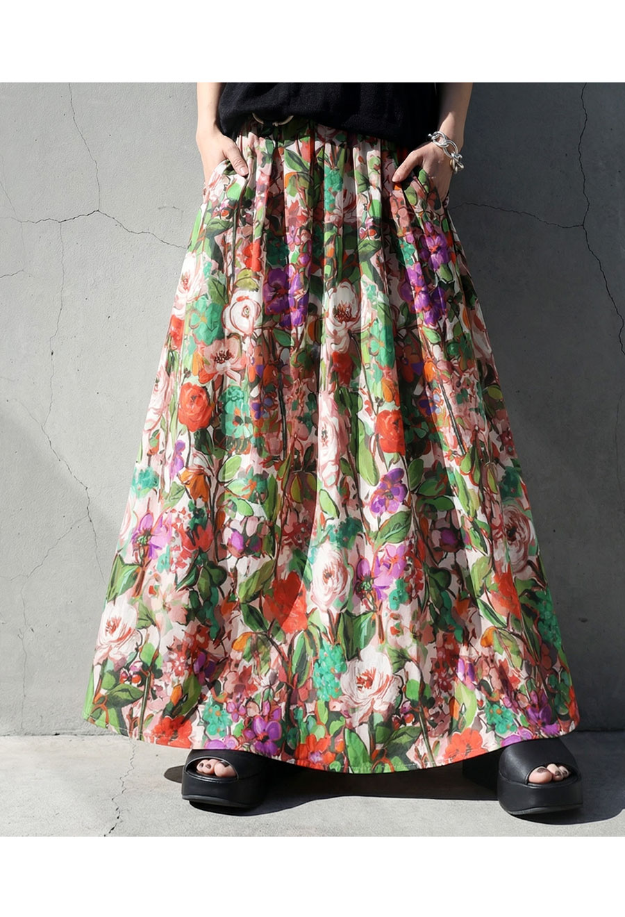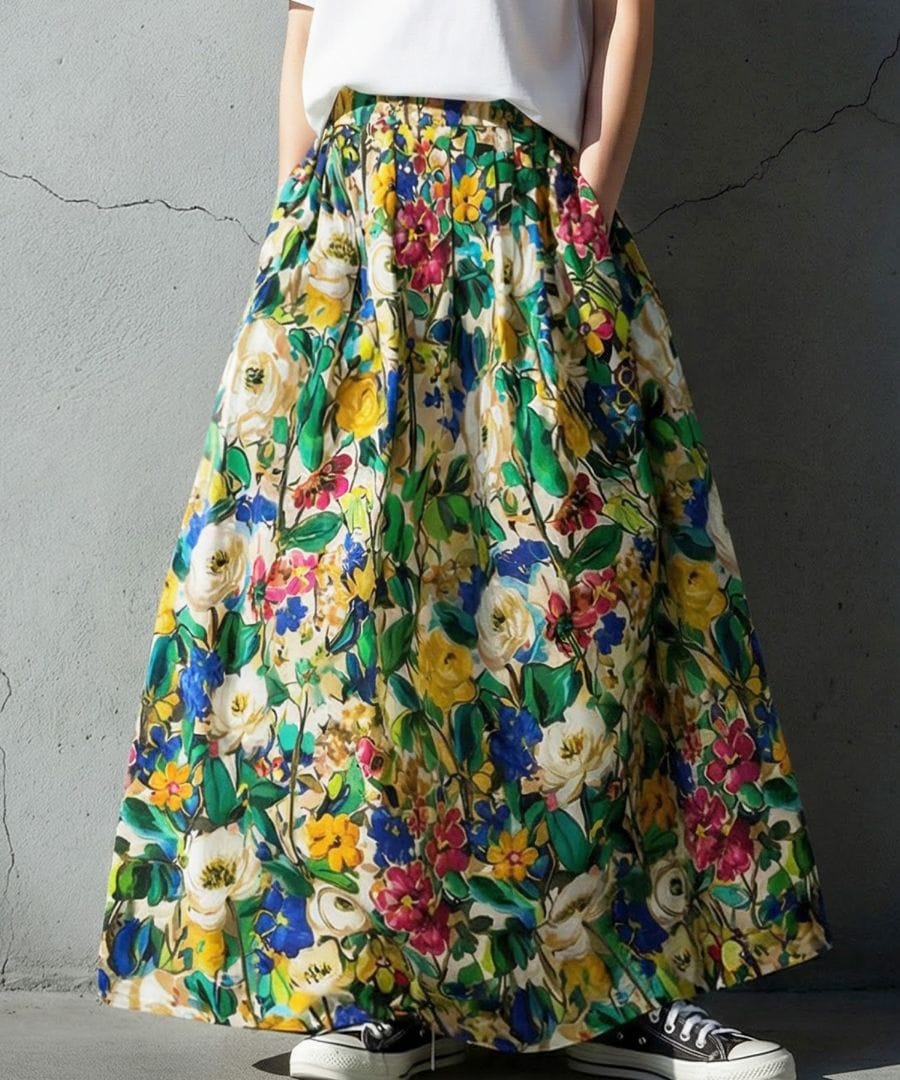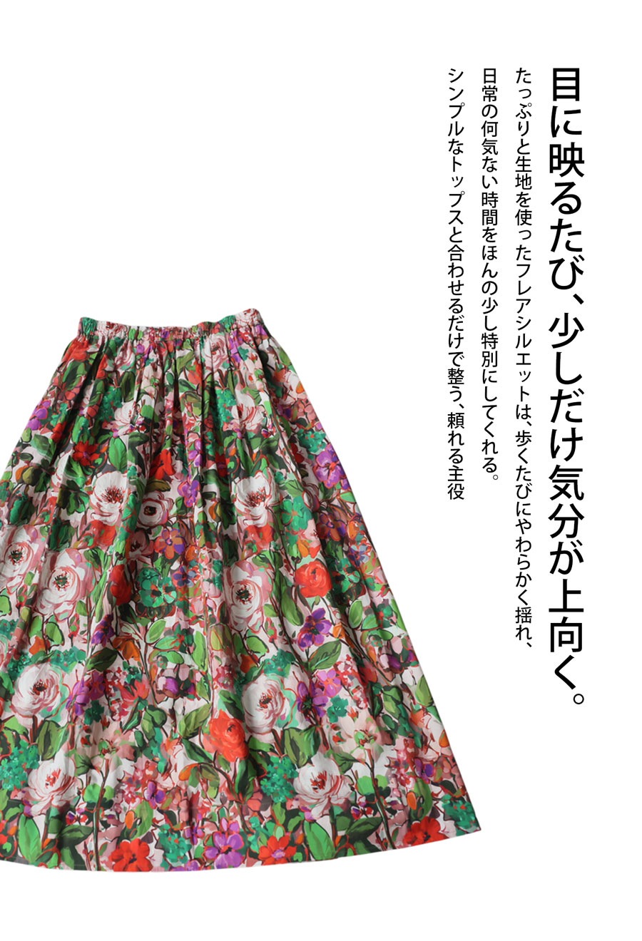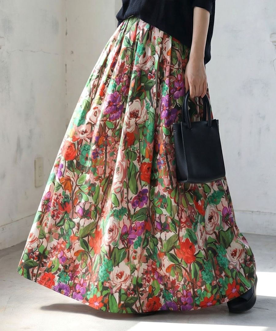 たっぷりと描かれた総花柄が目を惹く、存在感のあるロングスカートです。