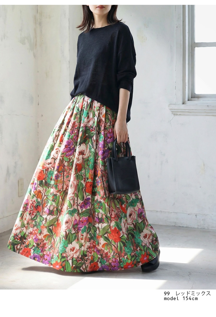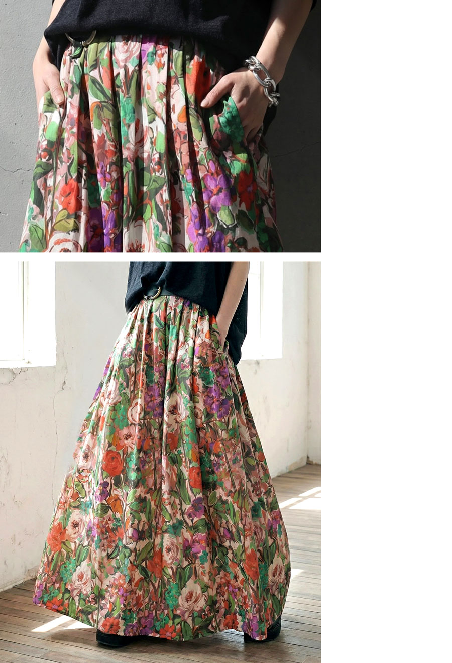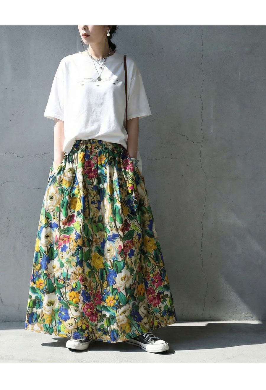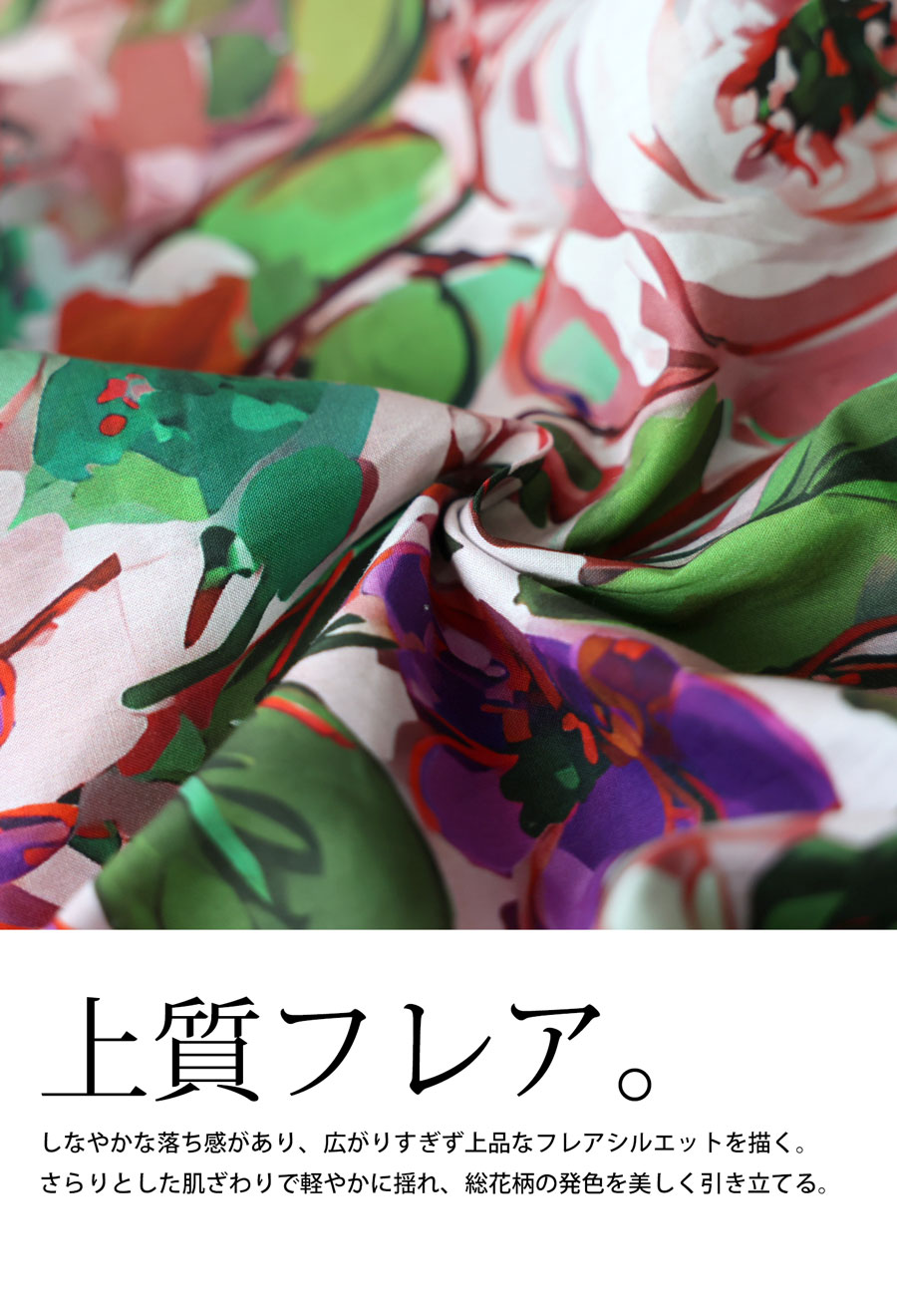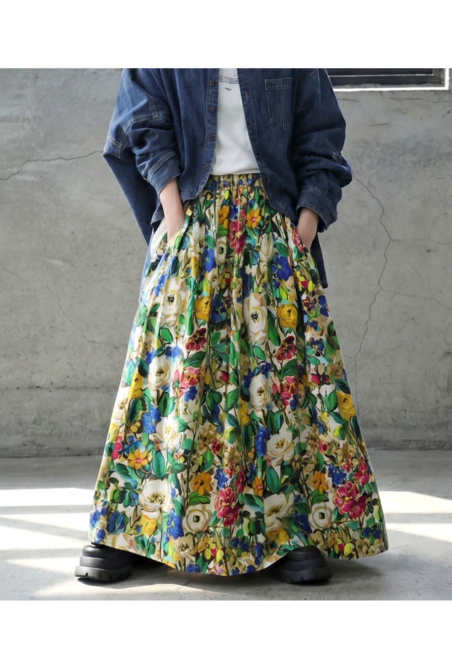 たっぷりと描かれた総花柄が目を惹く、存在感のあるロングスカートです。