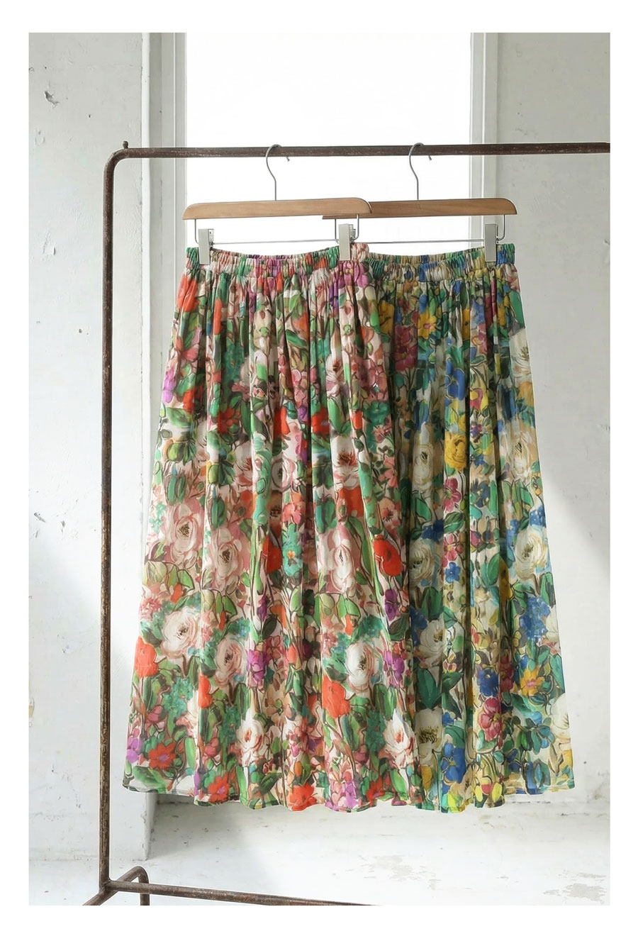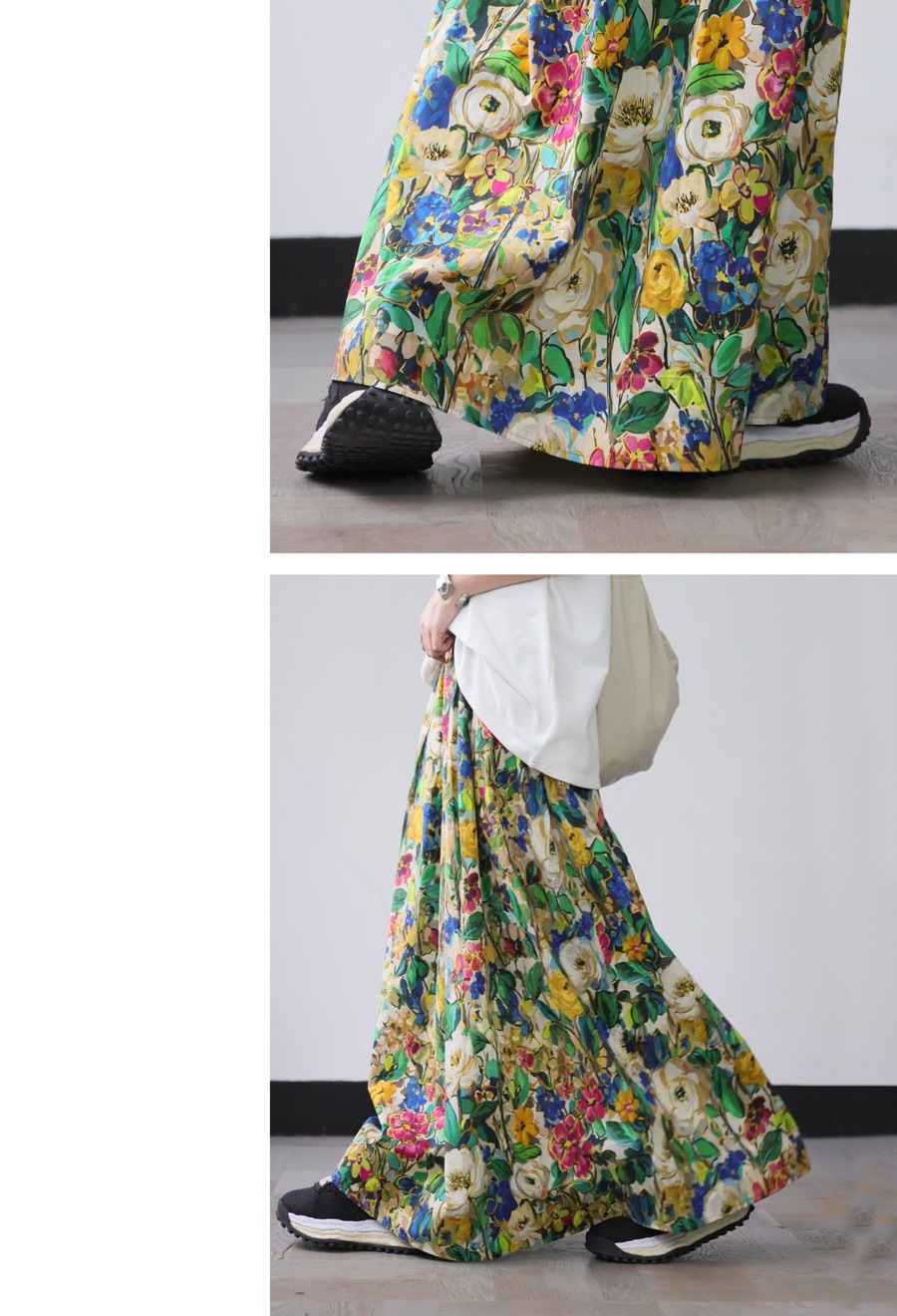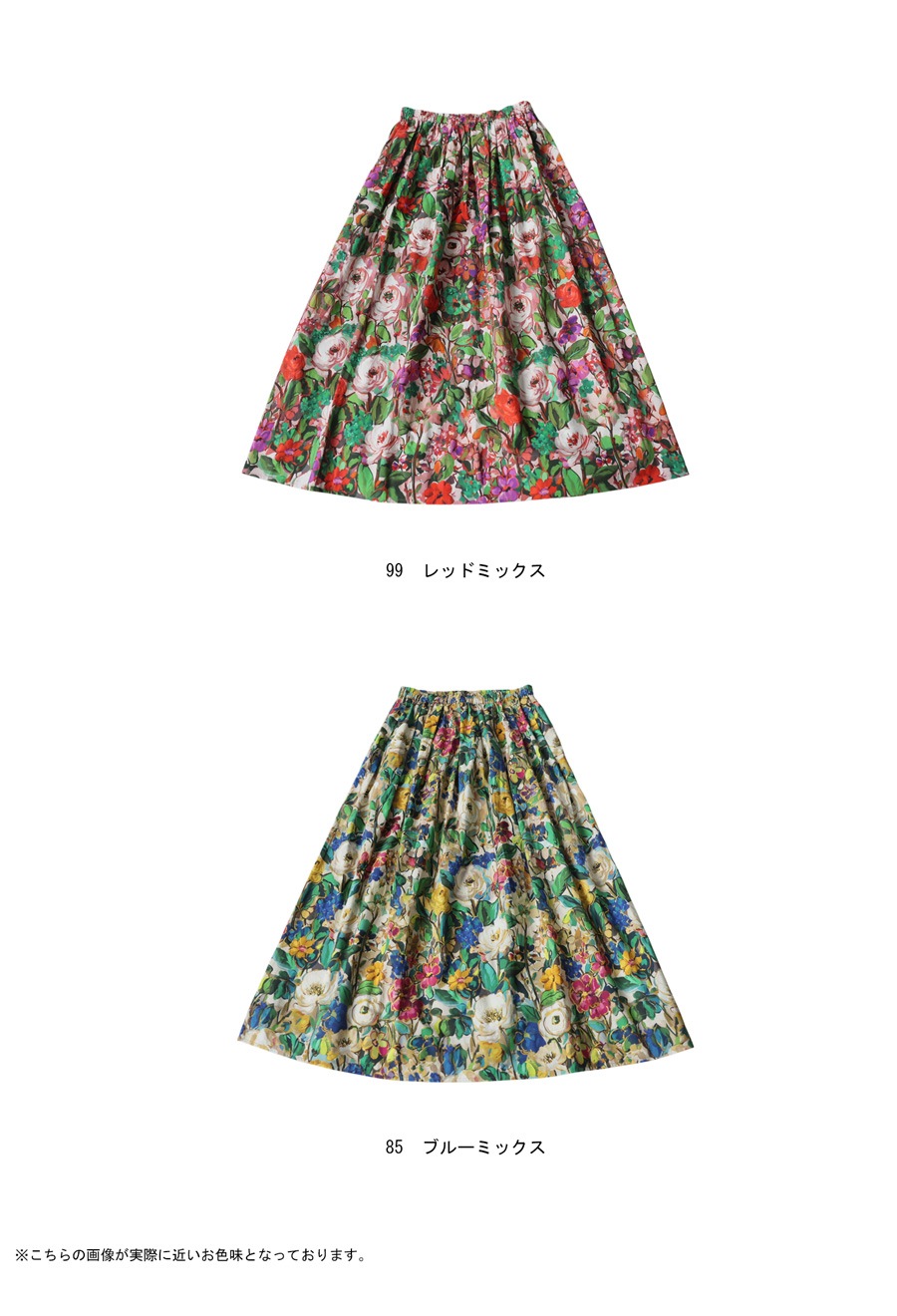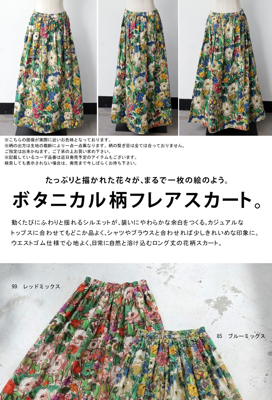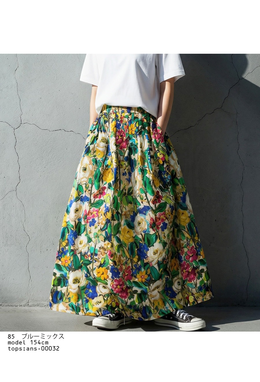 たっぷりと描かれた総花柄が目を惹く、存在感のあるロングスカートです。