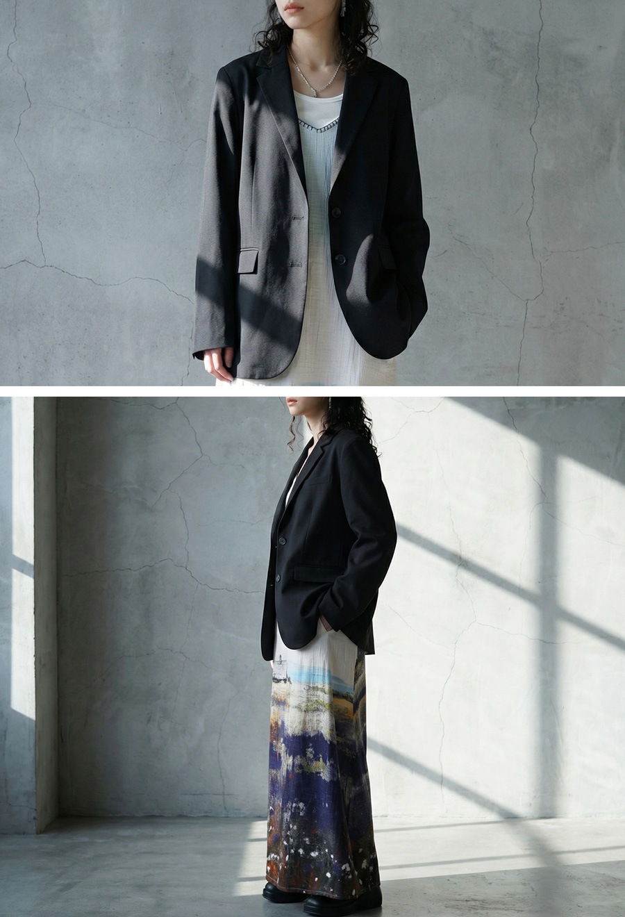 端正なテーラードカラーが顔まわりをきれいめに整え、前開きのシングル仕様とフロントボタンが上品な高級感を添えます。