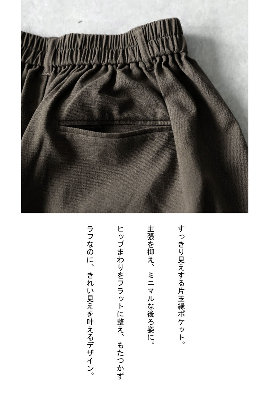 前フラット仕様でトップスインが美しく決まり、後ろゴムとサイズ調整ができる紐付きでリラックスした穿き心地を実現します。