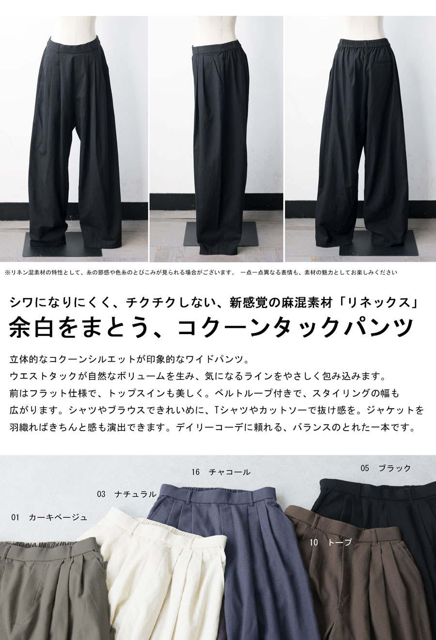 リネン混素材の涼やかな風合いを活かしたボトムス、コクーンパンツ(バレルレッグ)です。