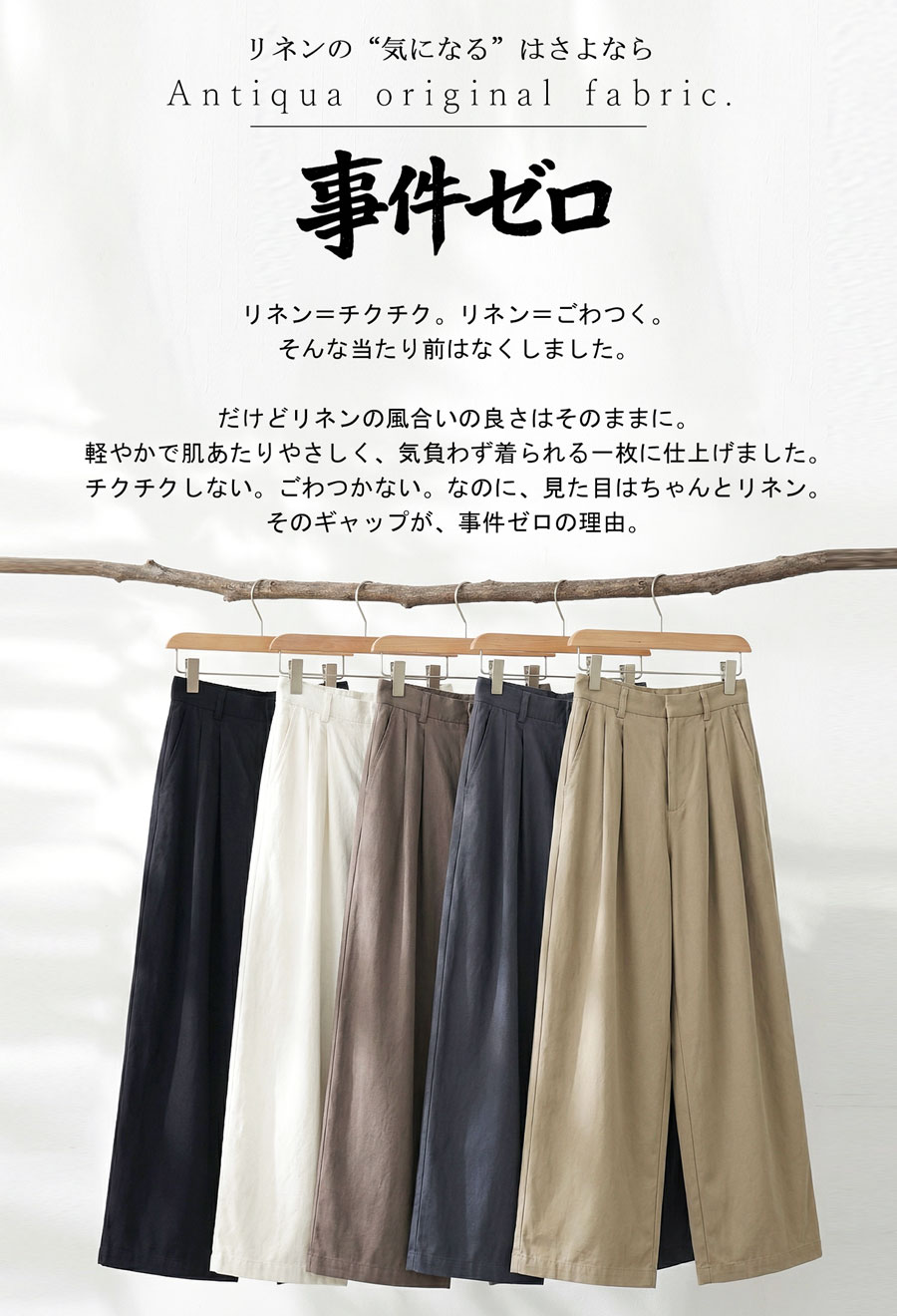 ナチュラル(生成り・きなり・Ecru)、トープ(ブラウン・Taupe)、チャコール(墨黒・Charcoal)、カーキベージュ(ベージュ寄り・Khaki beige)、ブラック(黒・くろ・Black)の豊富なカラー展開で、デイリーや通勤、旅行など幅広いシーンに心地よく馴染みます。