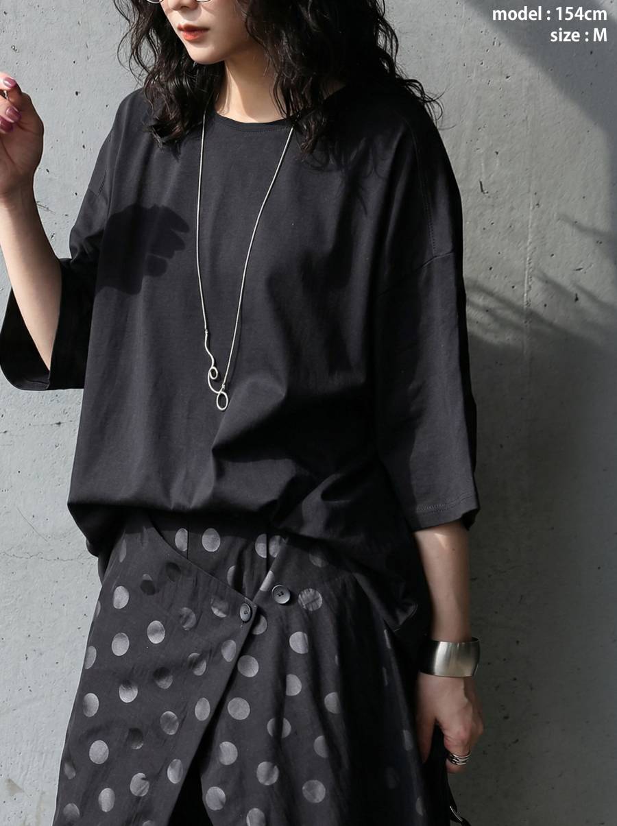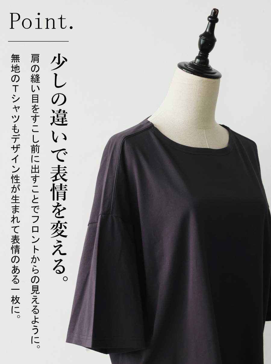 袖丈は肘にかかる五分袖(半袖)で気になる二の腕を自然にカバーしつつ、抜け感のあるバランスに仕上げました。