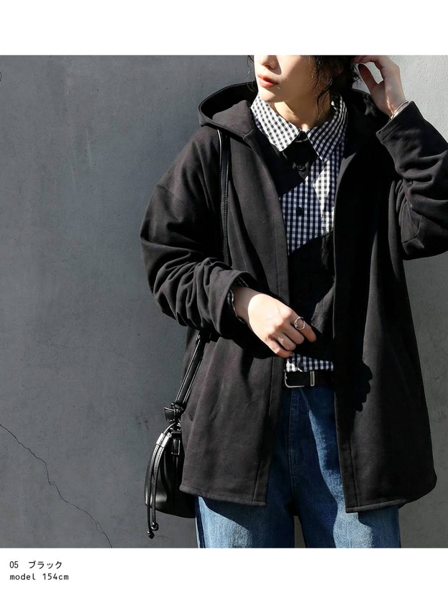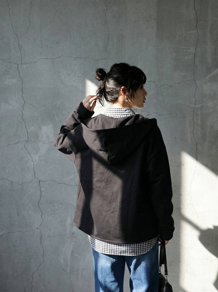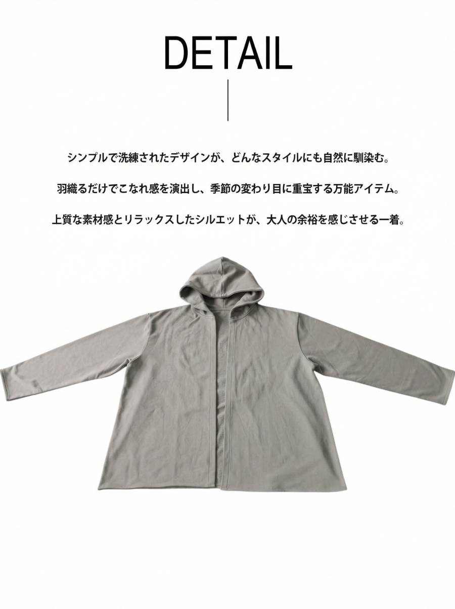 すっきりとしたネックラインから続くフードデザインが顔まわりを包み込みます。