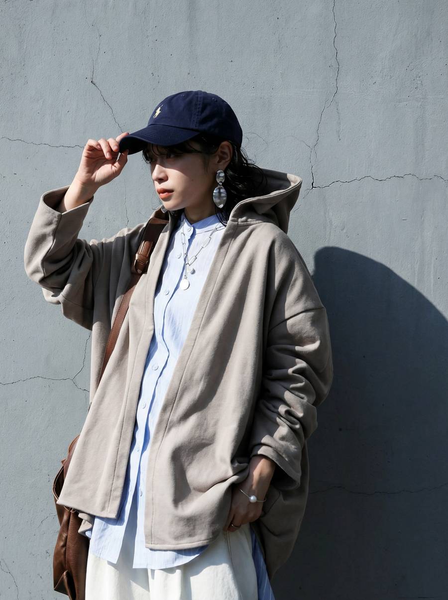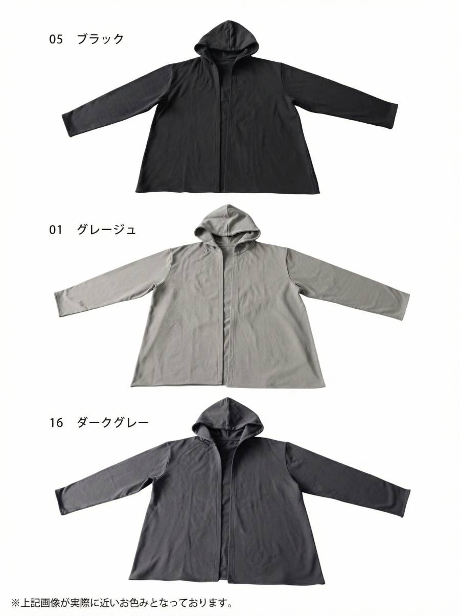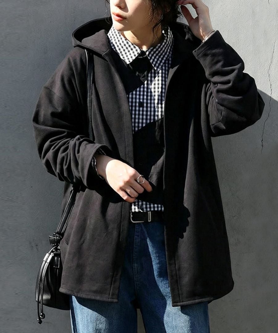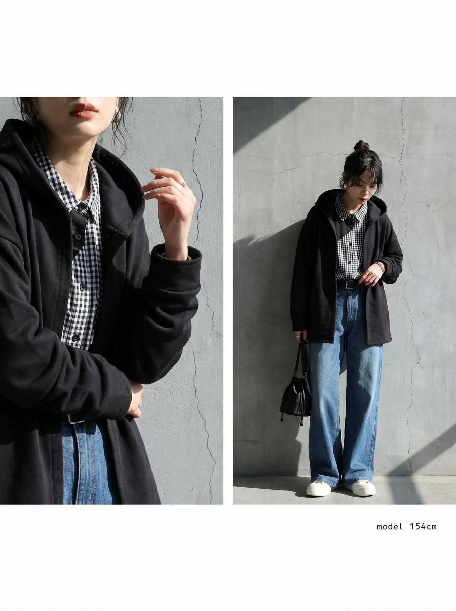 すっきりとしたネックラインから続くフードデザインが顔まわりを包み込みます。