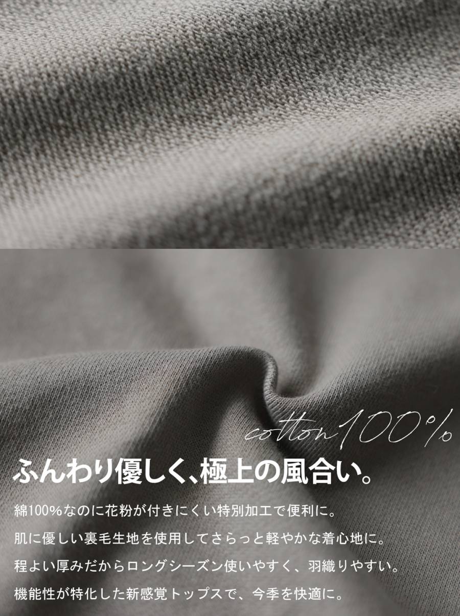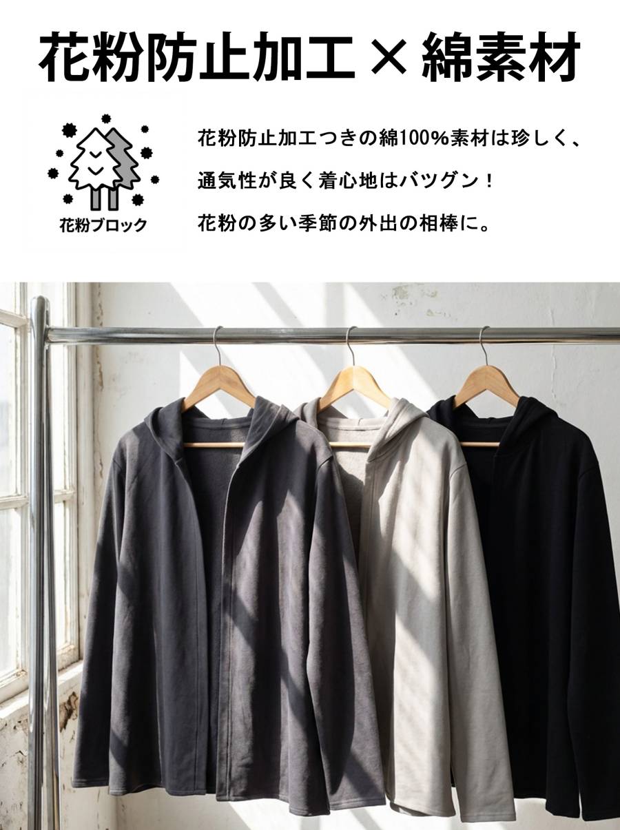 花粉防止加工を施した綿(コットン)100%素材のフード付きパーカーです。