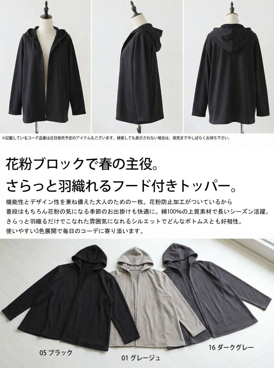【予約:4月上旬納期】花粉ブロックで春の主役。花粉 パーカー レディース 綿100% ライトアウター 送料無料・メール便不可
