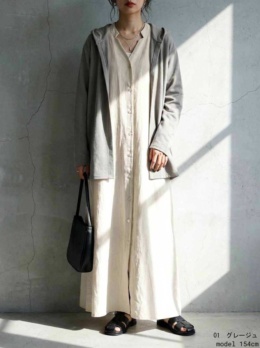 袖丈は手元までカバーする長袖仕様で、季節の変わり目にも活躍します。