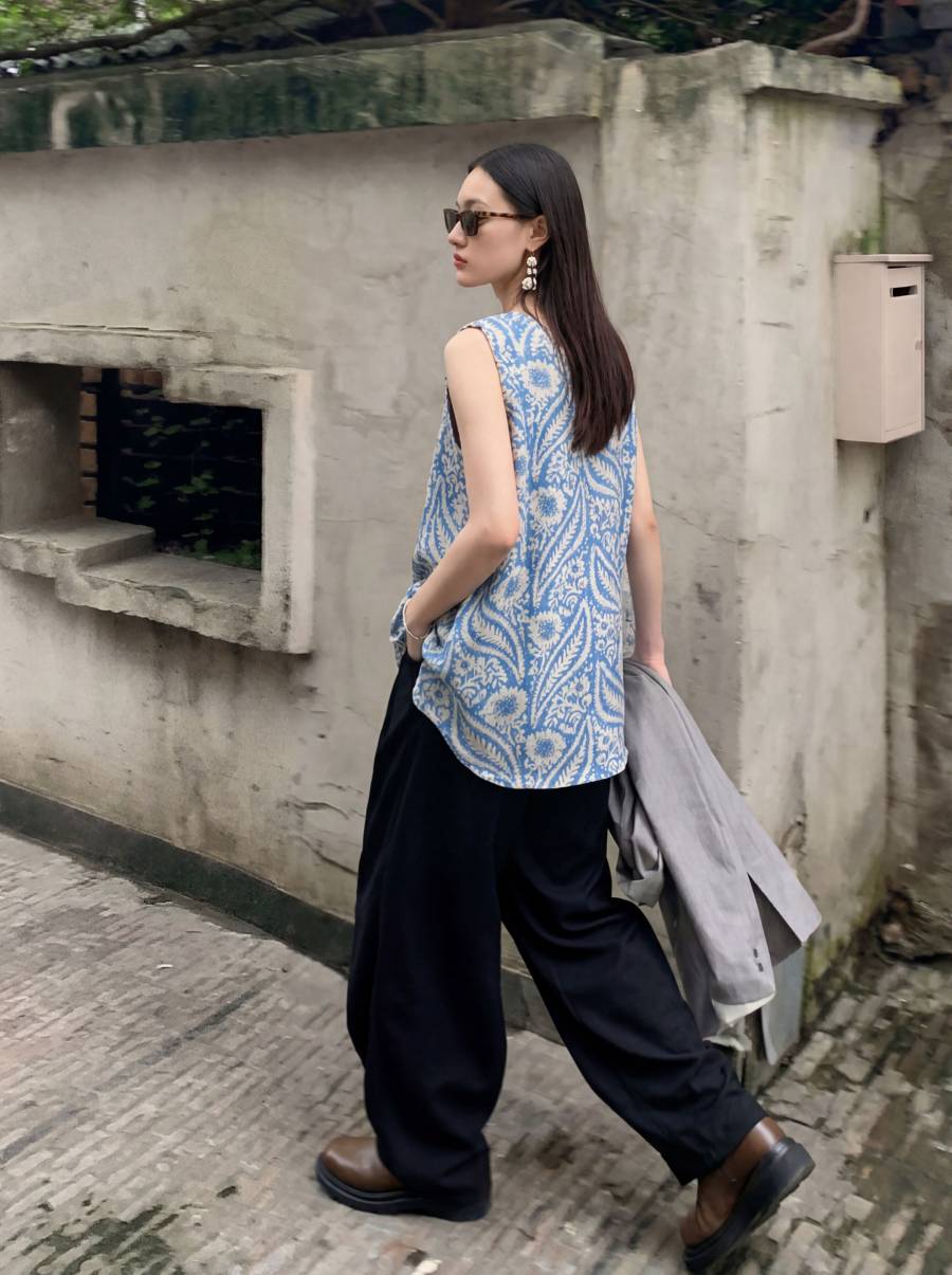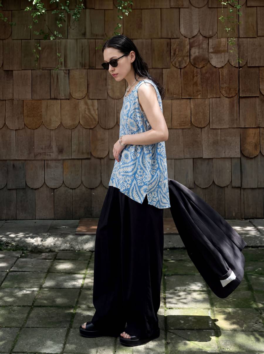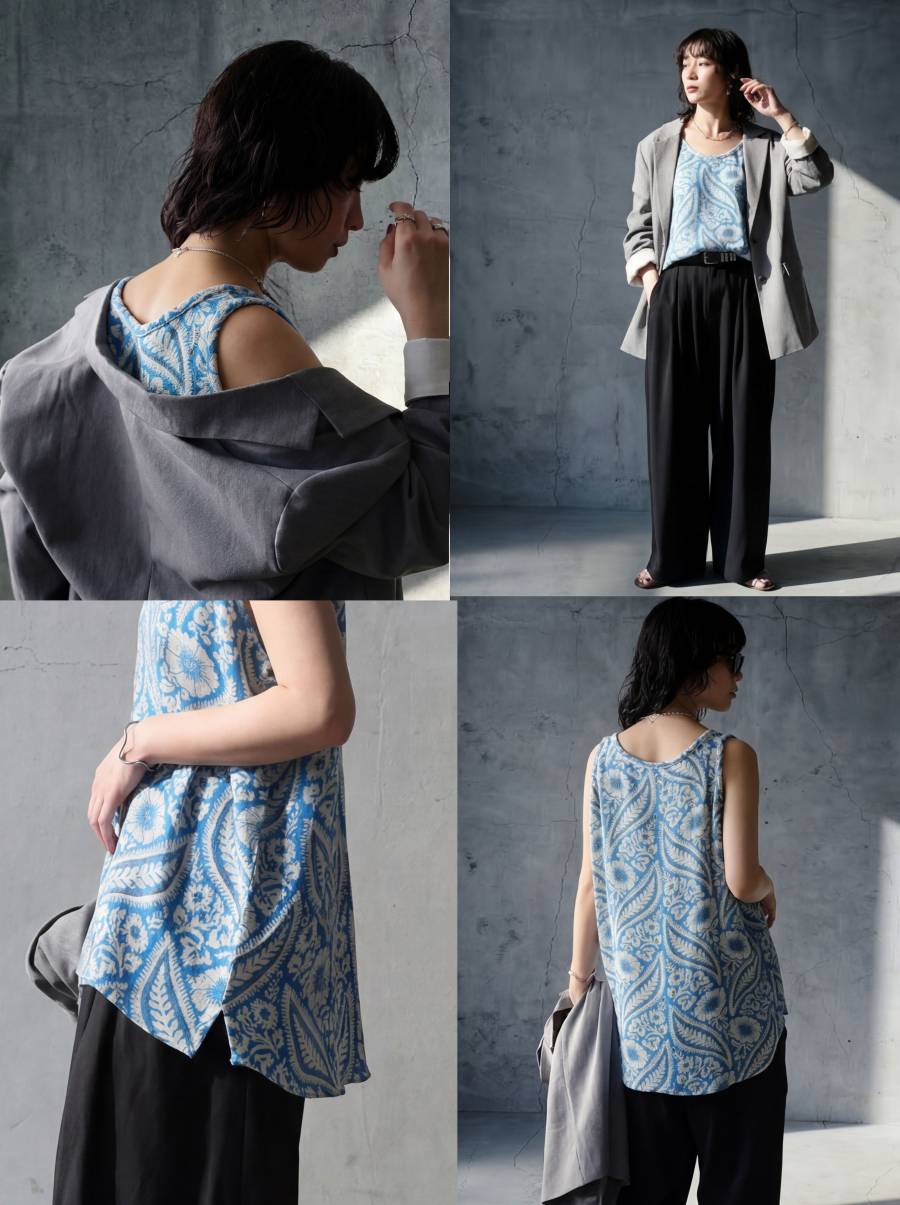 程よい開きのラウンドネックで顔まわりをすっきり見せ、袖丈のないノースリーブデザインが軽やかな印象に導きます。