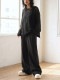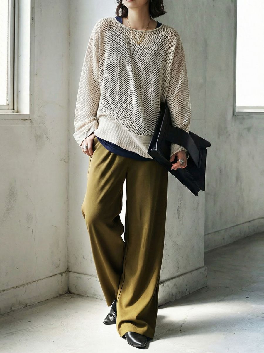 ボトムはセットにより異なり、パンツタイプにはストレッチ性のあるジョーゼット生地を採用。ウエストは総ゴム+ドロスト仕様で、リラックス感と美シルエットを両立。ストレートラインで体型カバーと動きやすさを兼ね備えています。