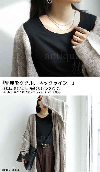 ・程よい開き具合のUネックがきれいなデコルテを作ってくれる。